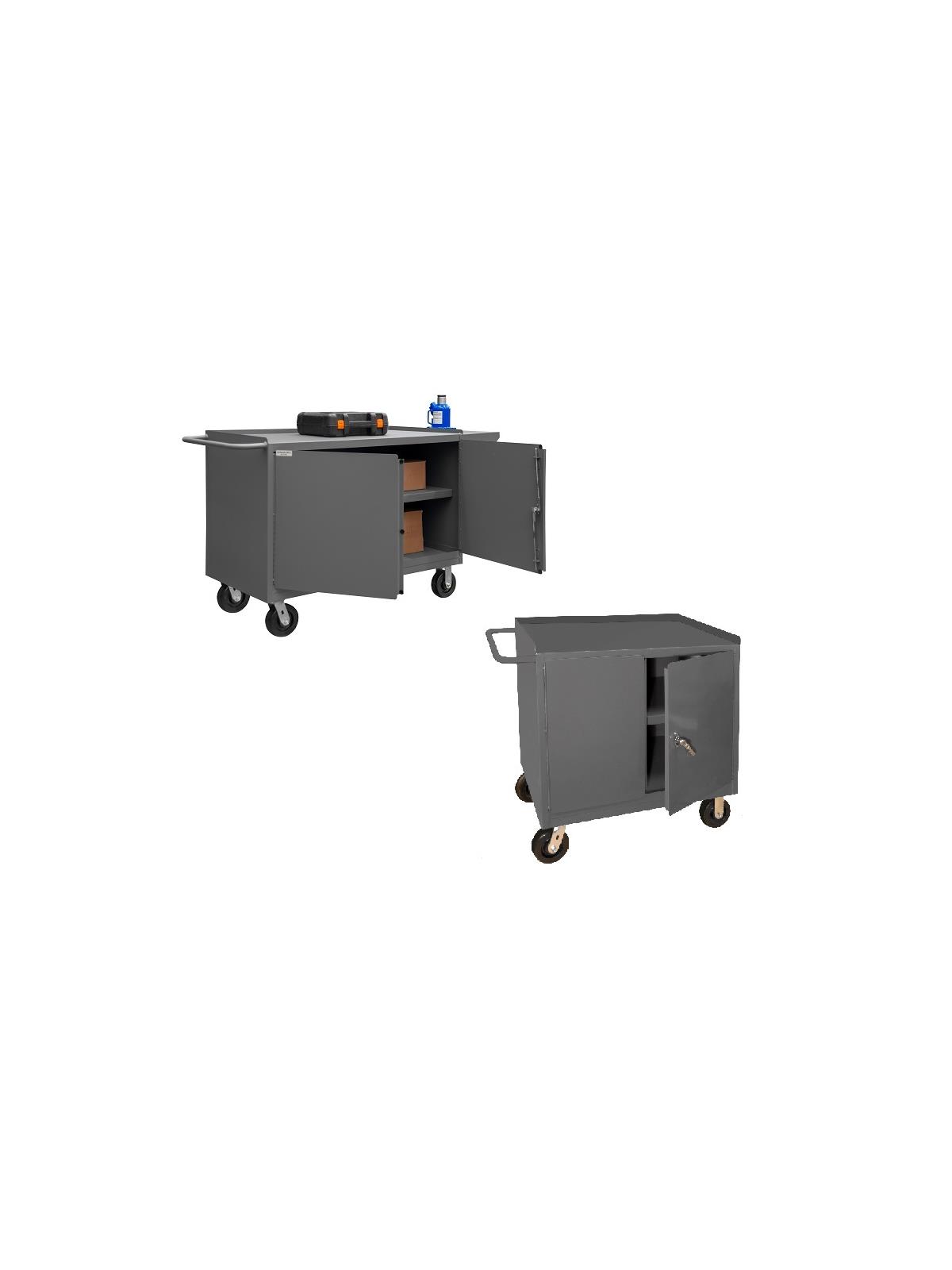 Choose from two models to store, sort and organize. High capacity, heavy-duty mobile cabinets combine storage, security, mobility and a work surface. Ideal for factories, warehouses or offices. Doors swing effortlessly, thanks to full length piano hinges. Doors also feature three-point locking handle and two keys. Casters are 6" x 2" phenolic bolt-on, two swivel and two rigid. Capacity of 2,000 lbs. Gray powder coat finish. FOB Shipping Point.