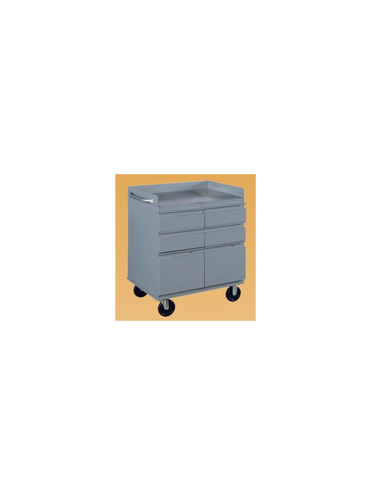Drawers have full extension drawer slides, rated at 125 lbs. per drawer. Heavy duty 14 gauge work surface with 3" back and end stops. Heavy duty 5" casters (2 rigid, 2 swivel with brakes). Powder coated finish. Standard color is Gray. FOB Shipping Point.