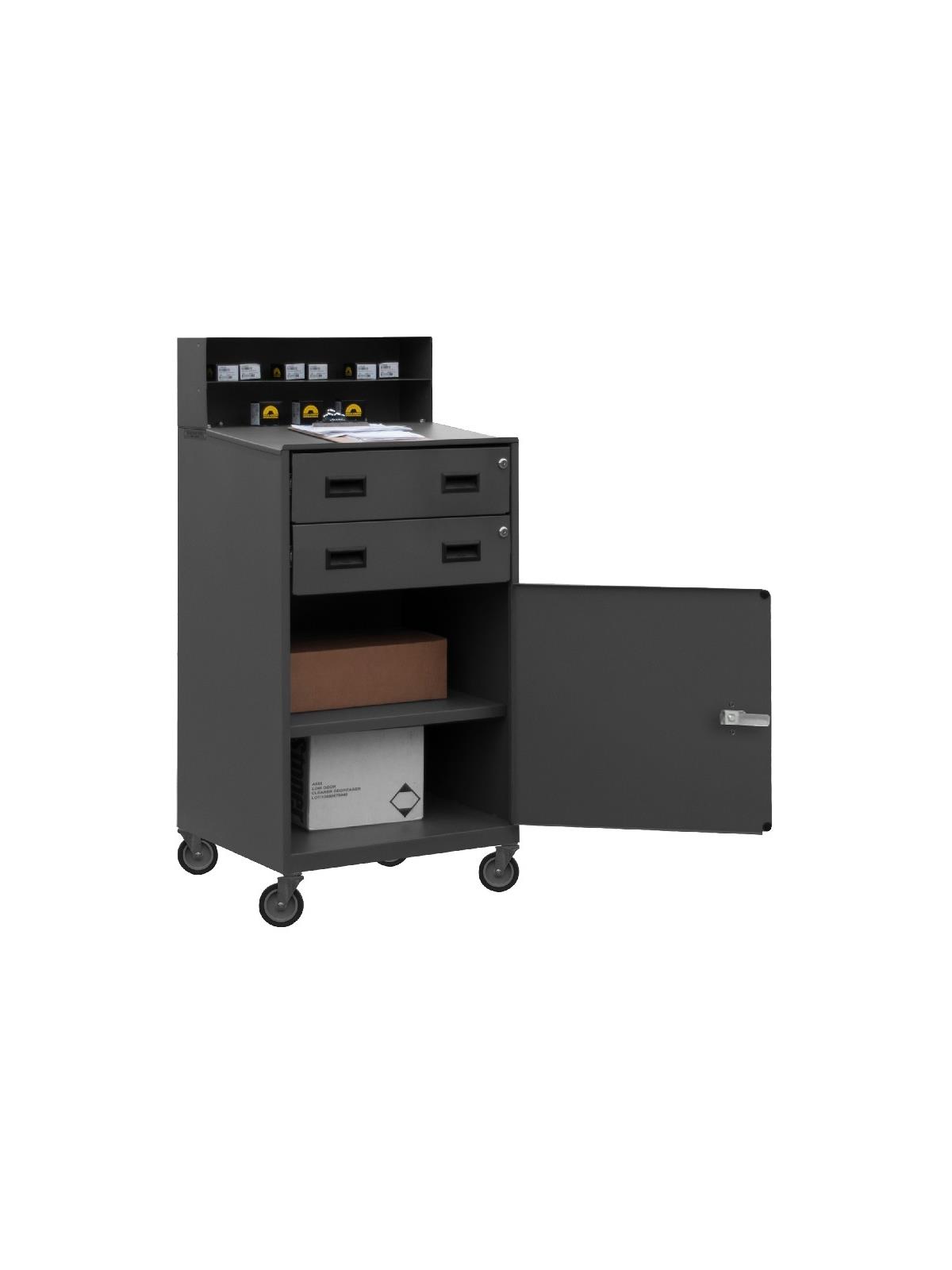 HMSD-2023-95 - Features a sliding drawer with cylinder lock and compartments for storing pens, pencils and more. Lip at base of work surface keeps items from falling off the sloped top. Rolls on four 3" rubber swivel plug-in casters. Gray powder coat finish. Shipped assembled and ready for use. HFED-2023-95 - Features 2 sliding drawers with compartments for storing pens, pencils and more. Lower storage compartment has a single point locking handle. 2 keys are provided. Lip at base of work surface keeps items from falling off sloped top. Rolls on four 3" rubber swivel plug-in casters. Gray powder coat finish. Minimal assembly required.