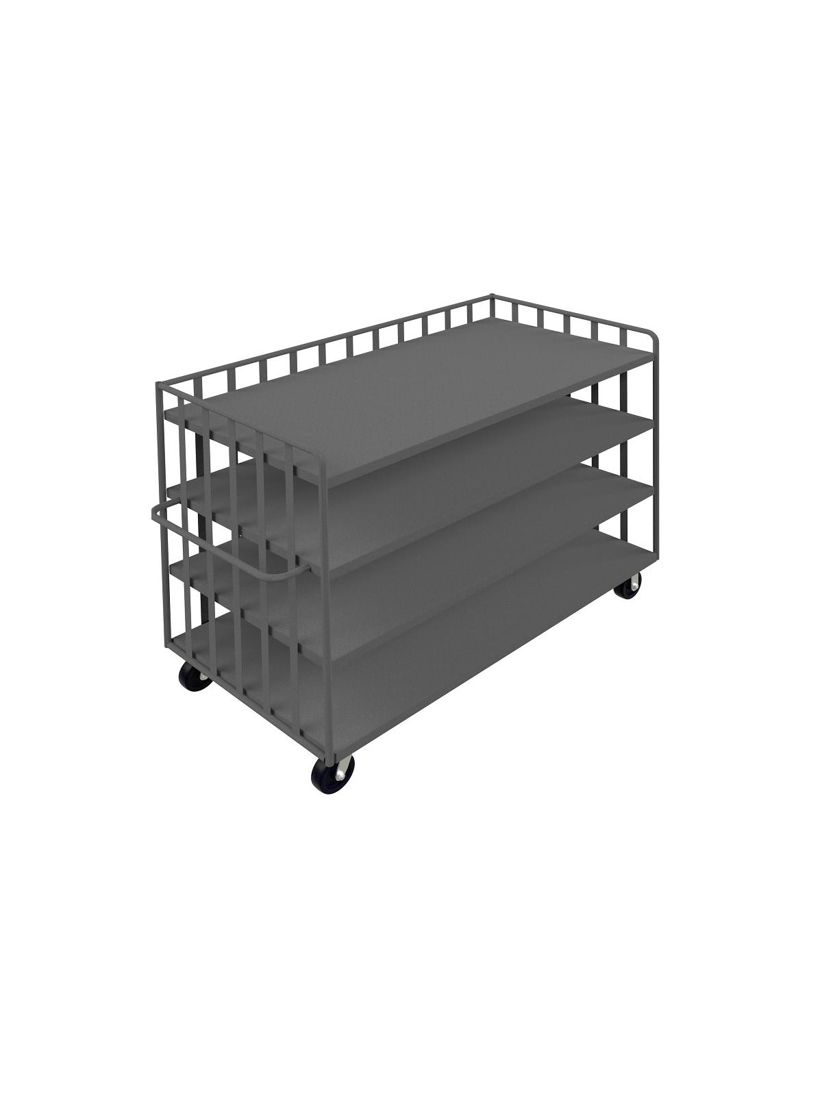Built for heavy 2000 lb. loads. Frame is made from 1" steel tubing. 1/2" rods on sides and back. 14" clearance between shelves. Steel shelves slope 1" from front to rear preventing contents from falling off during transport Shelves are made of 14 ga. steel. Smooth rolling 6" x 2" phenolic bolt-on casters, 2 swivel, 2 rigid. All units are 58"H. Gray powder coat finish. FOB Shipping Point.