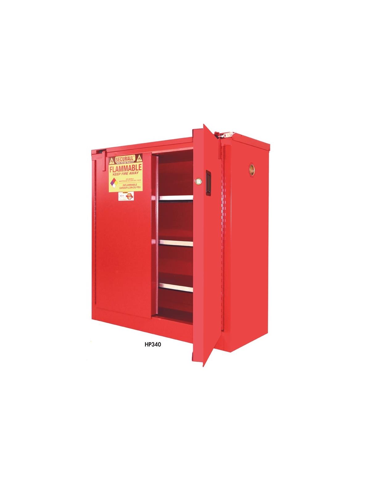 Safety storage cabinets for 1 gallon paint cans are available in 20, 40, 60 and up to 120 gallon capacities. Finished in safety urethane paint, unless otherwise specified. Warning label reads "Flammable - Keep Fire Away". Perfect for print shops or auto body repair shops. All models are FM approved. FOB Shipping Point.