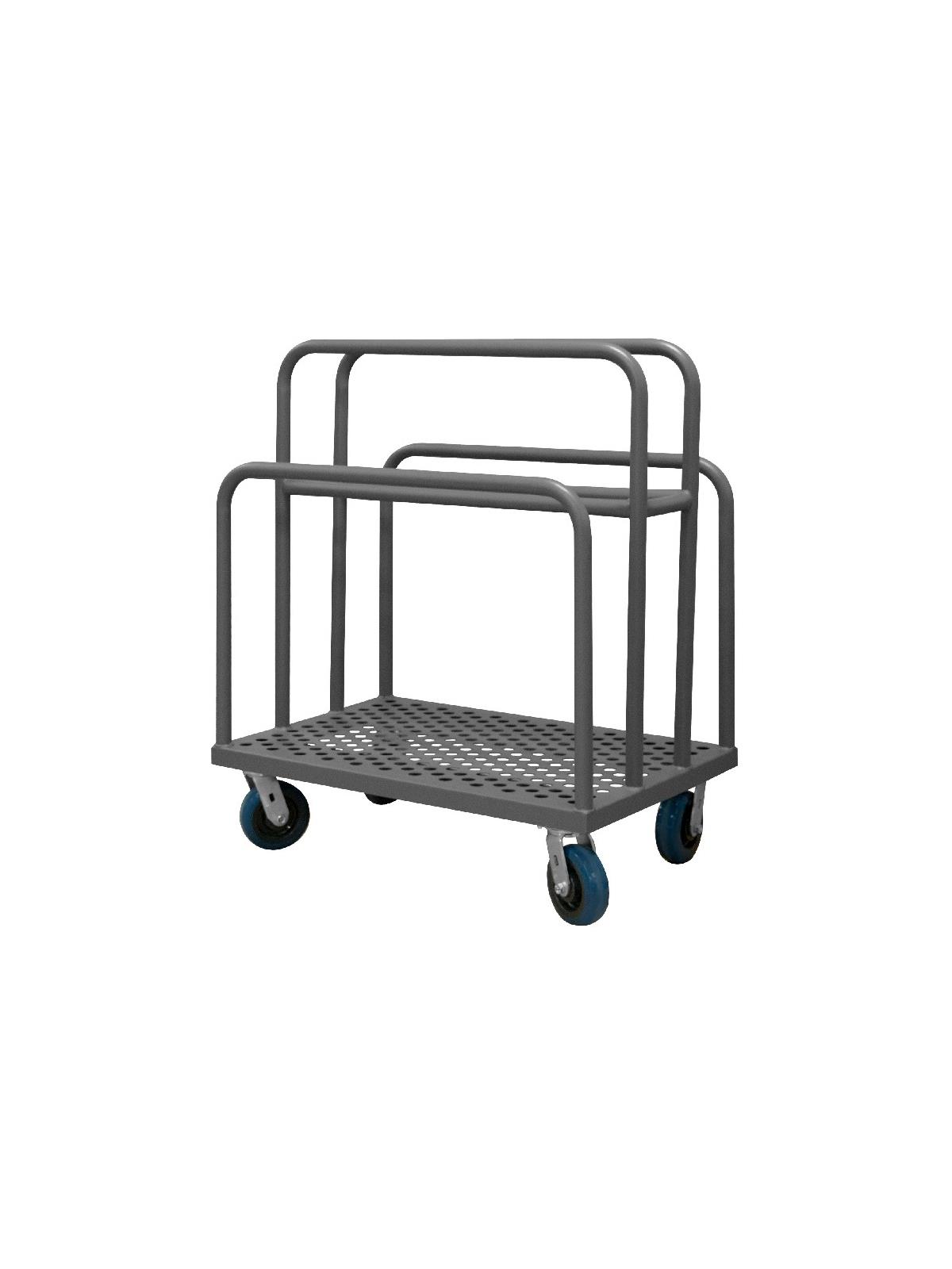 Heavy duty, 14 gauge, steel platform. Easy to access and pick up on-board product. Allows for the storage and transportation of various sizes of panels & products. Durable, gray, textured powder coat finish. FOB Shipping Point.