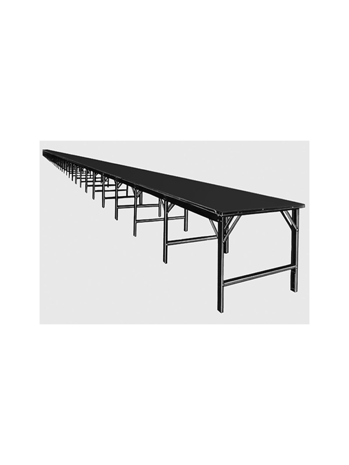 Heavy 12 ga. steel interlocking frame has smooth rolled edges throughout. Parallel apron rails form a permanent top and track edge. Adjustable legs raise top from 33 - 37"H. Invisible steel spline clamping bars connect tops to form a smooth continuous surface. Tops in either hardboard or plastic laminate over high density flake core. Ships KD. FOB Shipping Point.