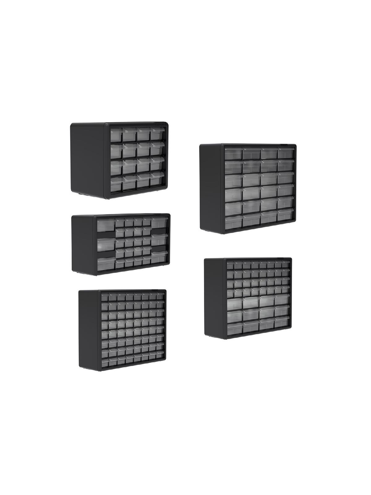 Organize and protect your office, hardware and craft supplies. Clear drawers offer easy content identifications and are dividable to expand storage options. Finger-grip drawer pulls provide easy access and rear stop tabs prevent contents from spilling. Cabinets stack securely and can also be wall mounted with keyhole slots. A variety of drawer configuration provide versatile storage solutions. Wall mountable. FOB Shipping Point.