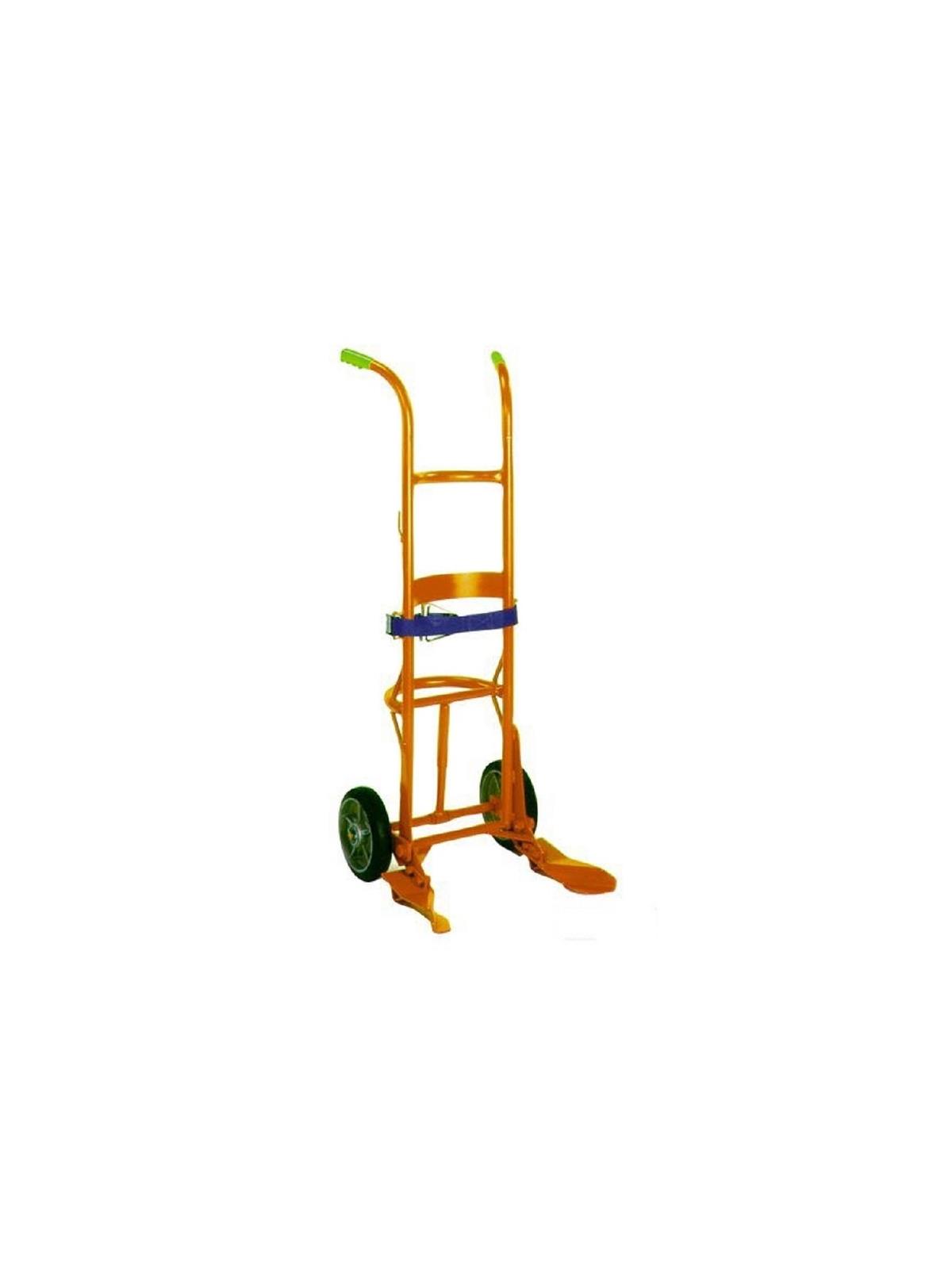 A) Standard Poly Drum Truck Handles all poly and fiber drums except overpacks. Features replaceable "feet" and belt. Wide "feet" and belt eliminate the risk of drums being punctured by nose prongs and chime hooks. Floating axle reduces effort required to break over and balance the load. 23.5"D. Patented design.