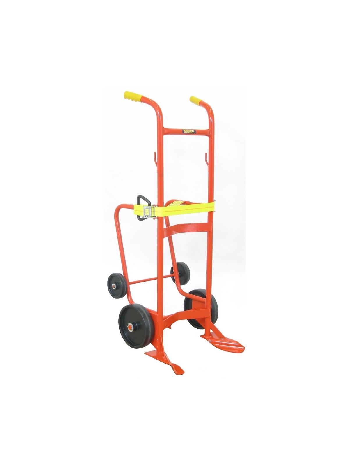 Recommended primarily for handling of 85 gallon overpacks. Long belt allows truck to handle all poly drums. Replaceable "feet" and belt. Wide "feet" and belt eliminate the risk of drums being punctured by nose prongs and chime hooks. Floating axle reduces effort required to break over and balance the load. 23.5"D. Patented design.