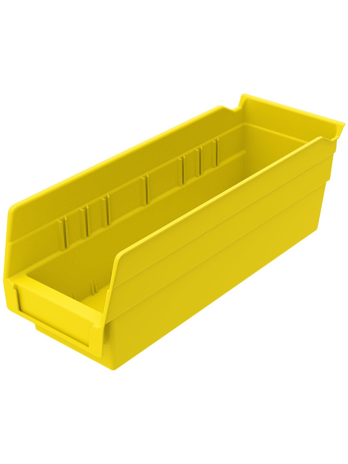 Outlasts corrugated bins - pays for themselves in reduced replacement costs. One-piece construction is waterproof and unaffected by grease or oil. Works with 12", 18" and 24" deep shelving, or vertical storage and retrieval units. Labels available. Available in 22 sizes and five colors - Red, Yellow, Blue, Green, or Semi-Clear. FOB Shipping Point.