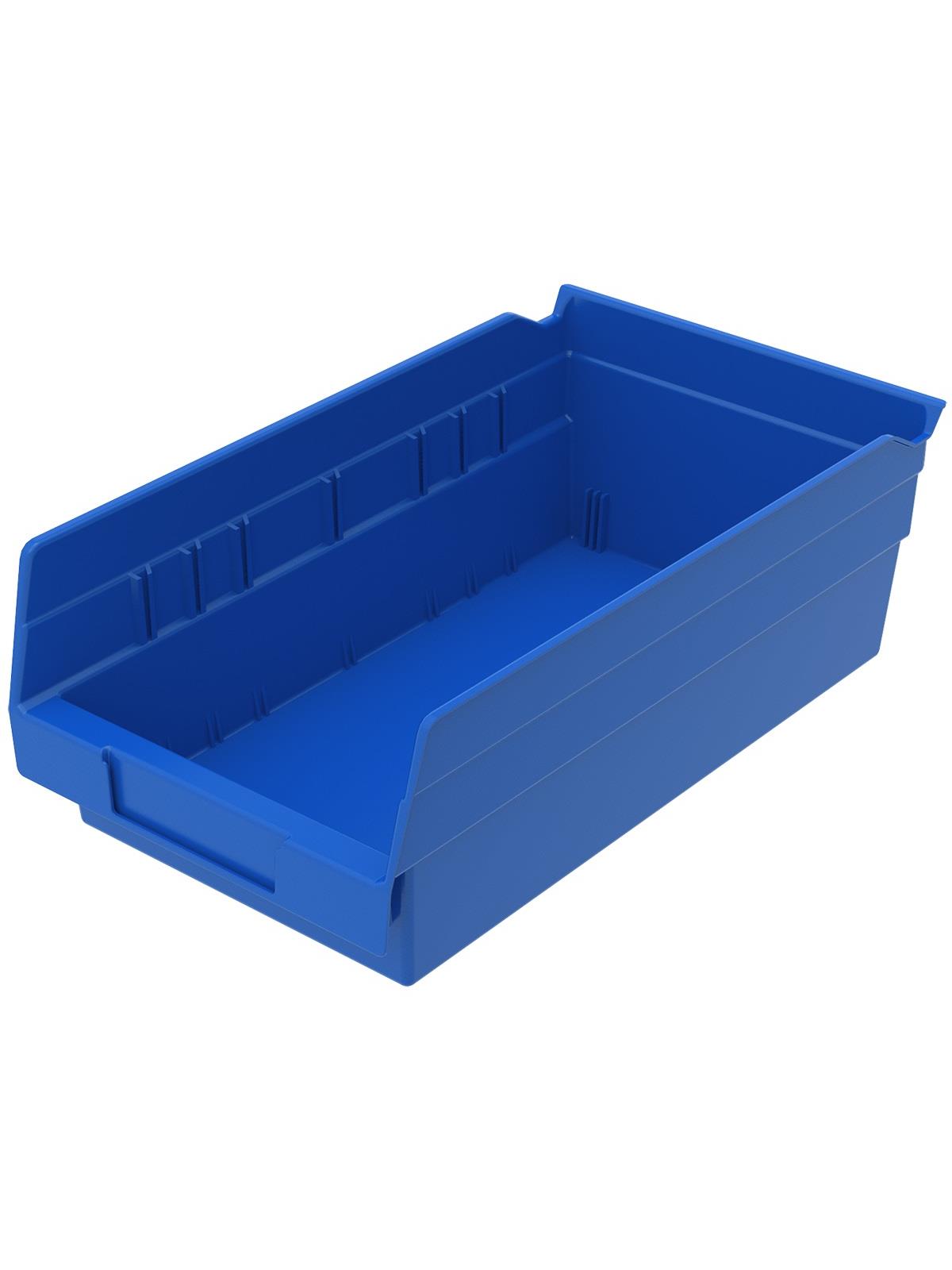 Outlasts corrugated bins - pays for themselves in reduced replacement costs. One-piece construction is waterproof and unaffected by grease or oil. Works with 12", 18" and 24" deep shelving, or vertical storage and retrieval units. Labels available. Available in 22 sizes and five colors - Red, Yellow, Blue, Green, or Semi-Clear. FOB Shipping Point.