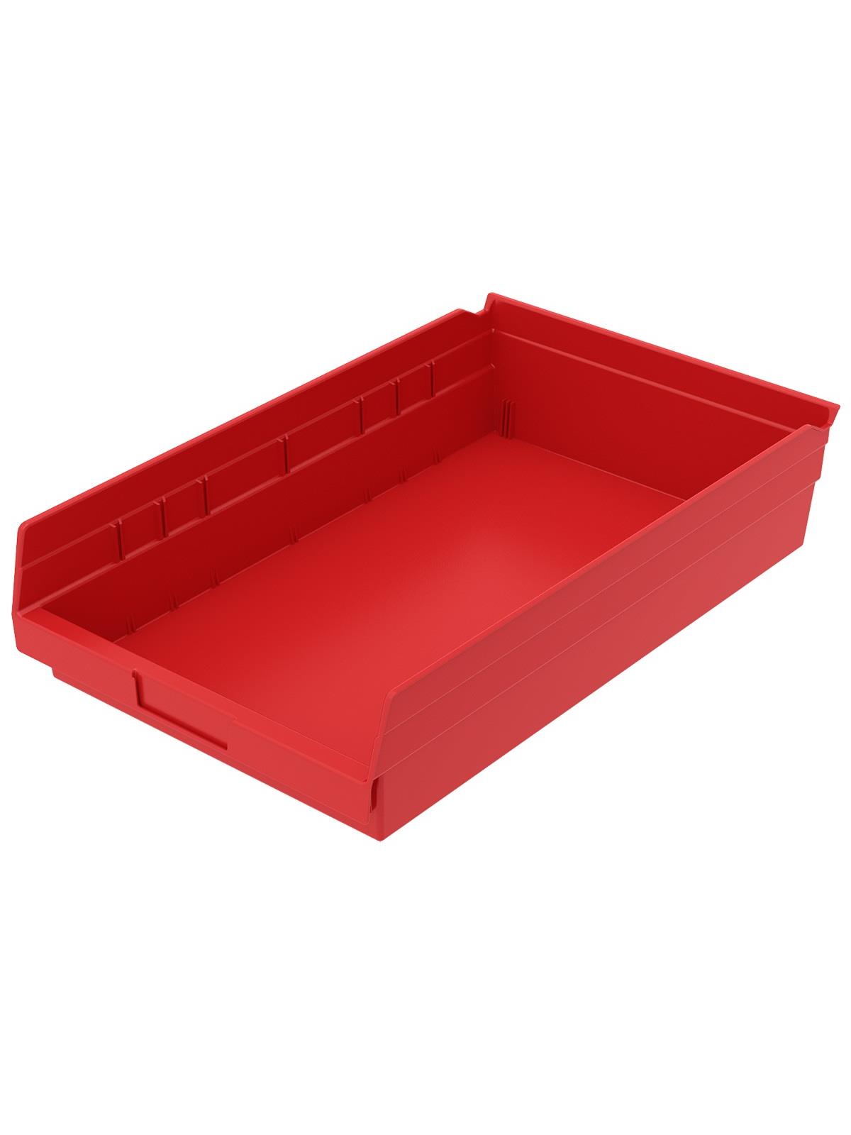 Outlasts corrugated bins - pays for themselves in reduced replacement costs. One-piece construction is waterproof and unaffected by grease or oil. Works with 12", 18" and 24" deep shelving, or vertical storage and retrieval units. Labels available. Available in 22 sizes and five colors - Red, Yellow, Blue, Green, or Semi-Clear. FOB Shipping Point.