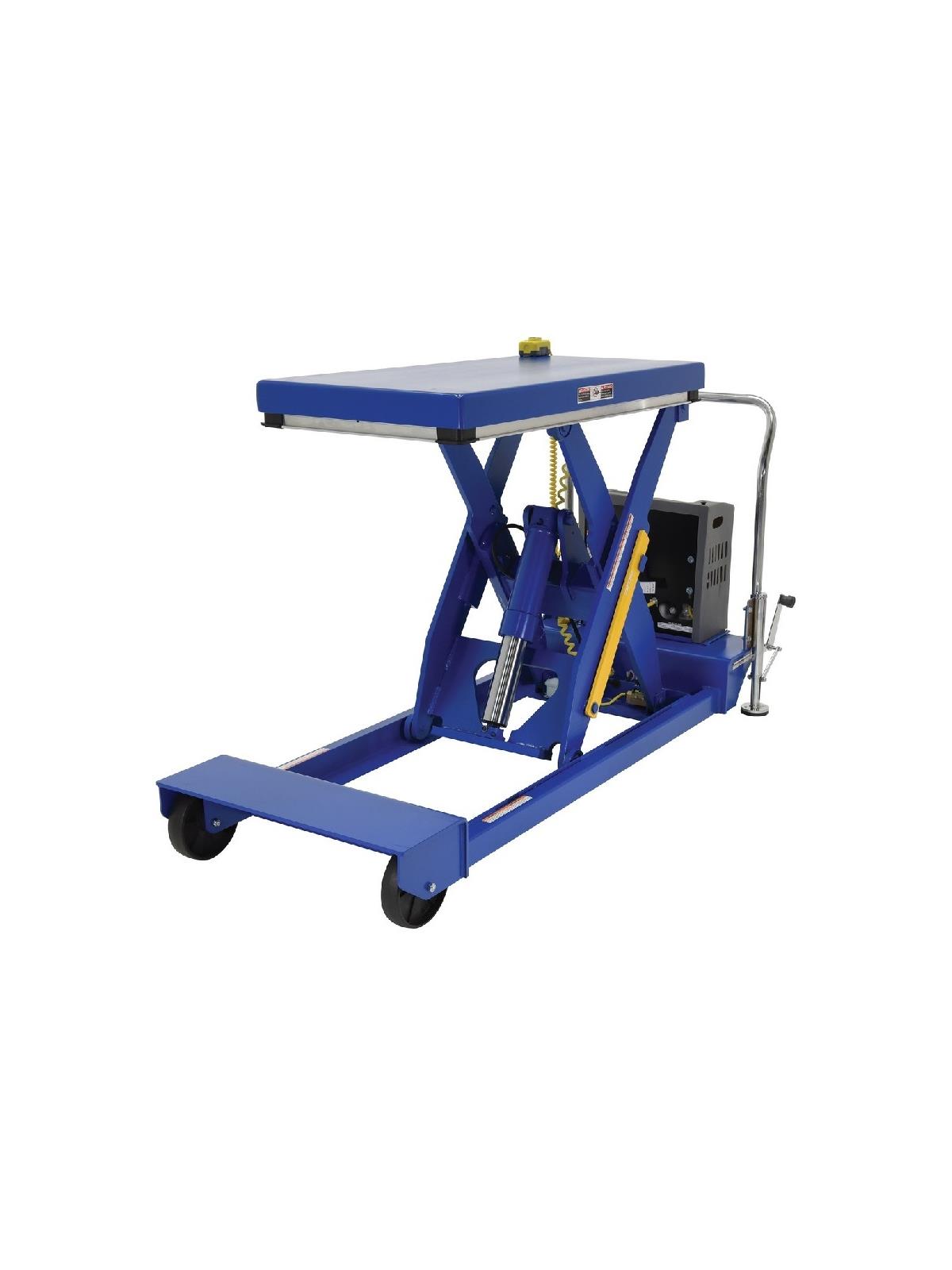 Heavy duty 12V DC power unit with deep cycle battery and an on-board battery charger is standard. Rolls on 8" glass filled nylon casters, 2 swivel, 2 rigid. Complete with floor lock and patented electric pinch point guards. Push buttons to raise and lower lift are located on the power unit and in the pendant style push button control. ON/OFF control for better security is built into the power unit. Add 28-1/2" to platform length for the overall length. Battery Charge Indicator Gauge now standard on all DC units. FOB Shipping Point. Due to tariffs and market conditions, pricing is subject to change. See Related Items tab for Portable Scissor Lift Table Options.