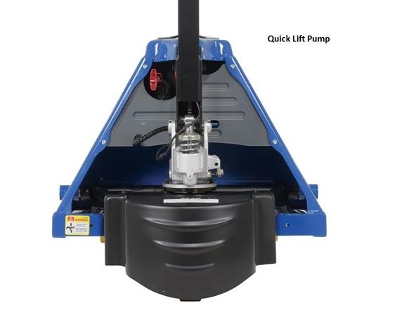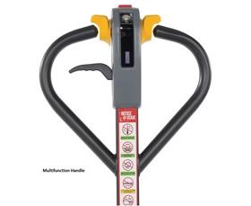 Semi-electric pallet truck with quick lift (powered drive, manual lift) and controlled (slow) lowering. Say good bye to your manual pallet truck! Multi-function ergonomic handle with emergency reverse, battery indicator, horn, and forward/reverse butterfly switch. Unit can be operated when handle is in up position (Up-right driving). Equipped with maintenance free 24V/115ah battery. Battery is interchangeable for continuous usage. FOB Shipping Point.