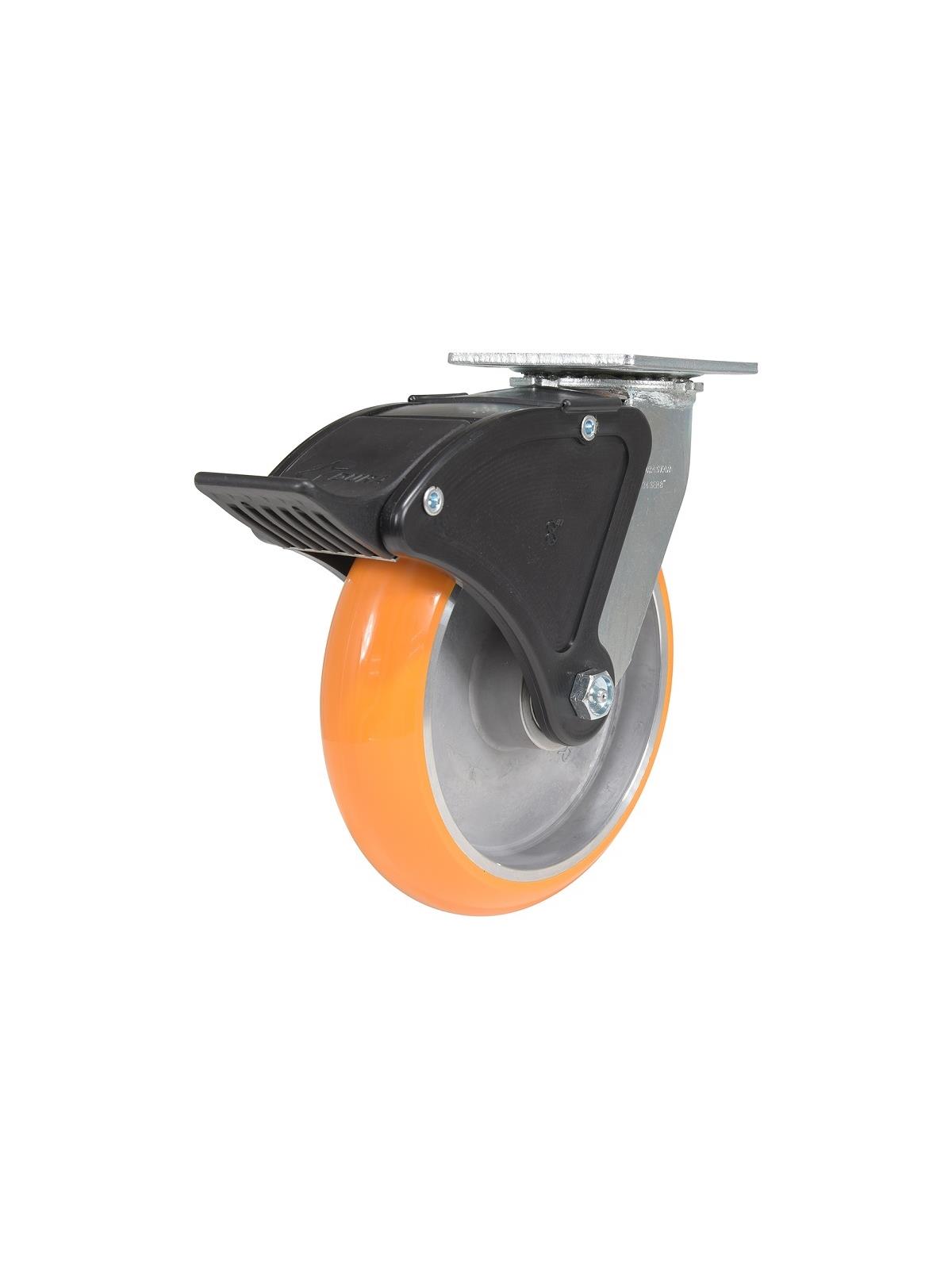 Made of exclusive proprietary donut tread. This caster comes with 6203 precision ball bearings and is bonded to a lightweight water-resistant aluminum core. The high grade elastic polyurethane reduces the force needed for movement and dampens vibrations for a smooth quiet roll. It also deflects debris, which strengthens its longevity and durability. Top plate size 4" x 4-1/2". FOB Shipping Point.