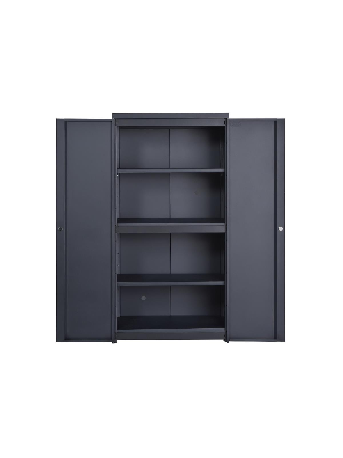 Made of quality aluminum and durable steel structural components. 50% lighter in weight than traditional steel cabinets for ease of assembly and shipping. Bolt-free design for easy assembly in minutes. 300 lb. capacity shelves of evenly distributed weight on tall cabinet; wall cabinet has 150 lb. shelf capacity. Tall cabinet has two fixed shelves plus two adjustable height shelves to accommodate various size items; wall cabinet has one adjustable shelf and one bottom fixed shelf. Modern recessed pull handles. Rubber grommet access holes allow cords through for charging. Adjustable foot levelers on tall cabinet to keep leveled on uneven surfaces. Door magnets keep door closed. Durable black textured finish. Mounting hardware included for wall cabinet. FOB Shipping Point.