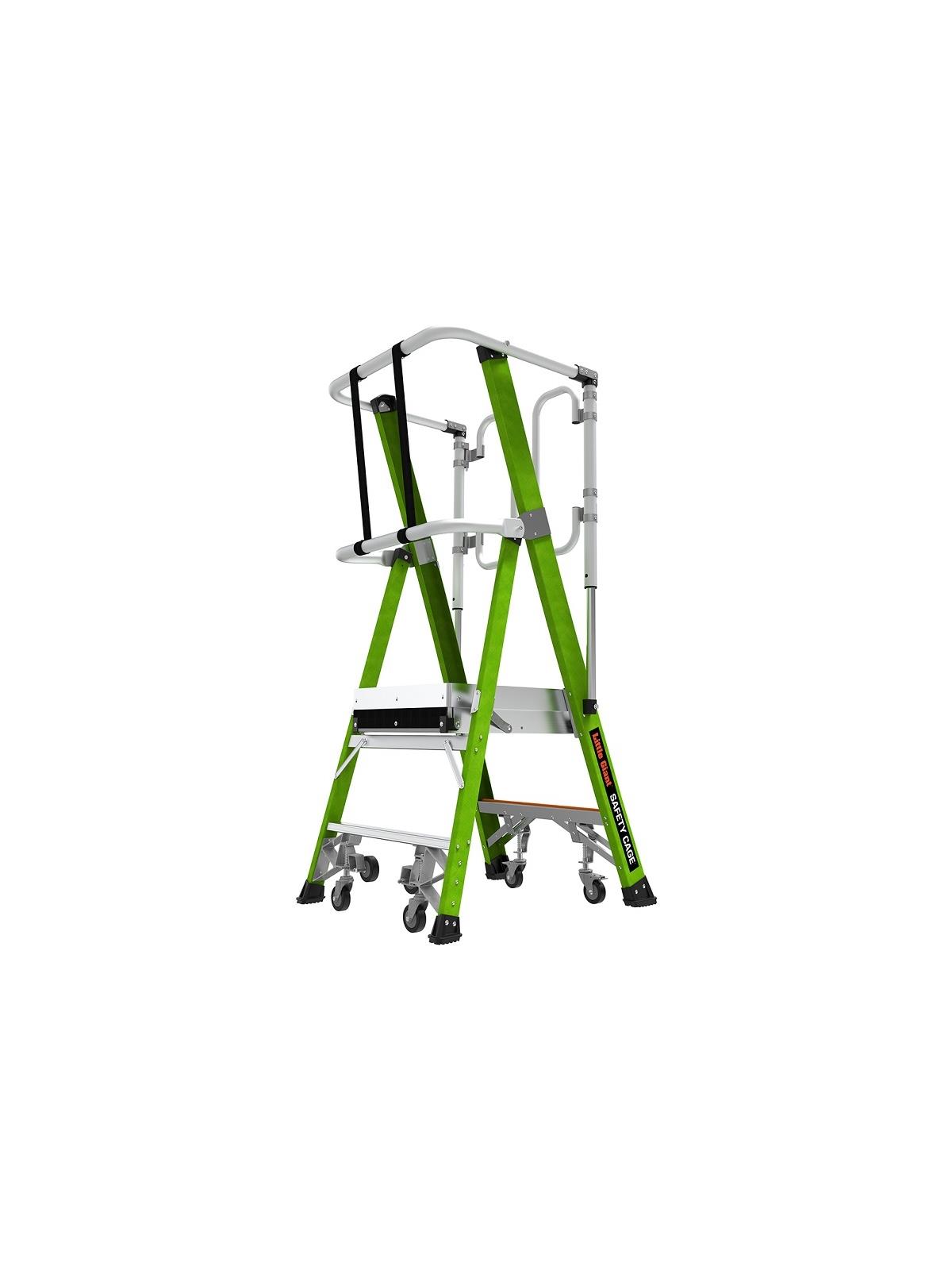 Constructed from a non-conductive fiberglass-resin composite, the Safety Cage folds compactly, making it easy to store. The Safety Cage can be set up with just one person. Descend the ladder with confidence knowing you will never miss the bottom rung again with the Ground Cue®. The Ground Cue alerts you with an audible "click" when you've reached the last rung on the ladder. The Safety Cage meets or exceeds all OSHA and ANSI standards and is rated IAA to hold 375 lbs. It is available in 4, 6, 8 and 10-foot sizes (platform heights of 2, 4, 6 and 8 feet respectively). FOB Shipping Point.