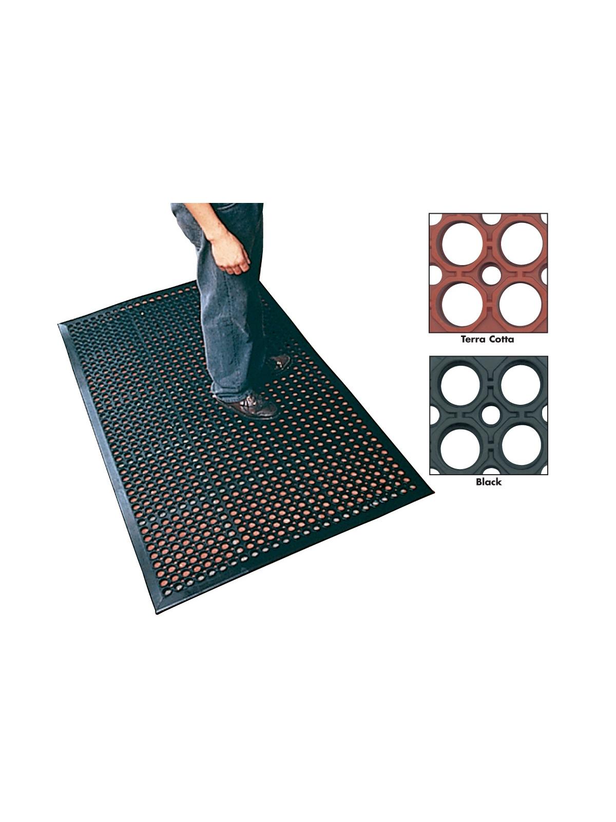 Safewalk Light is a heavy-duty drainage mat that provides resistance to oil and fats, while keeping employee productivity high. Mat has a low profile with molded beveled border for increased safety. The mat will provide better slip resistance for ceramic and cement flooring. Product comes in Black (rubber) or Terra Cotta (nitrile rubber). Grease-proof Terra Cotta recommended for fry stations, cook lines, and greasy industrial stations. Total thickness of mat is 1/2" and is typically seen in food processing, packaging and cafeteria applications. FOB Shipping Point.
