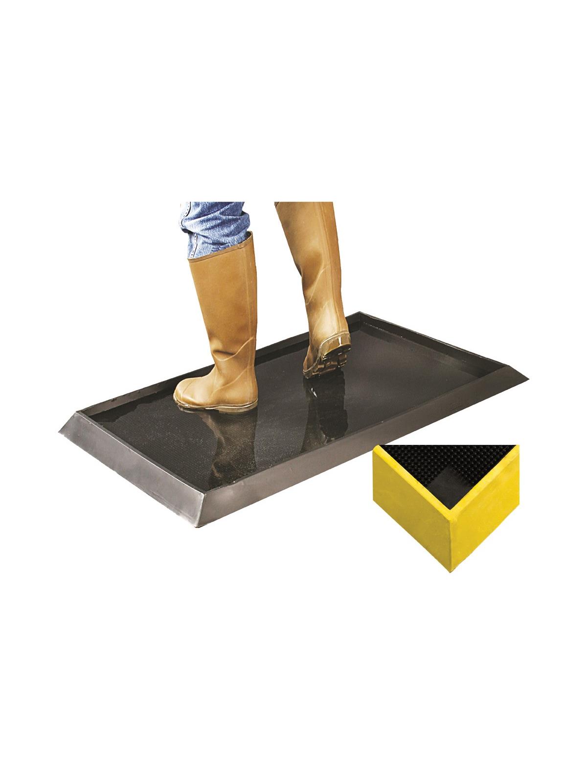 The Sanitizing Footbath Mat decontaminates shoes and boots, which can spread harmful germs and bacteria in food-production facilities. Fill the mat’s 1/2" or 2-1/2" deep well with disinfectant solution and then step in to clean footwear. FOB Shipping Point.