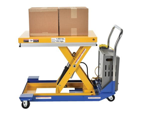 Electric motor is rated at 1600 watts. Operates on 12V DC power. Battery is 12V deep cycle for maximum life. Built-in battery charger is included (operated on 115V AC power). Includes UP and DOWN push-buttons built into power unit. Platform equipped standard with perimeter pinch-point guard for OSHA compliance. Includes 2 rigid and 2 swivel 4" x 2" phenolic casters with brakes. Push handle is removable. Includes an industry-best powder coat finish. FOB Shipping Point.
