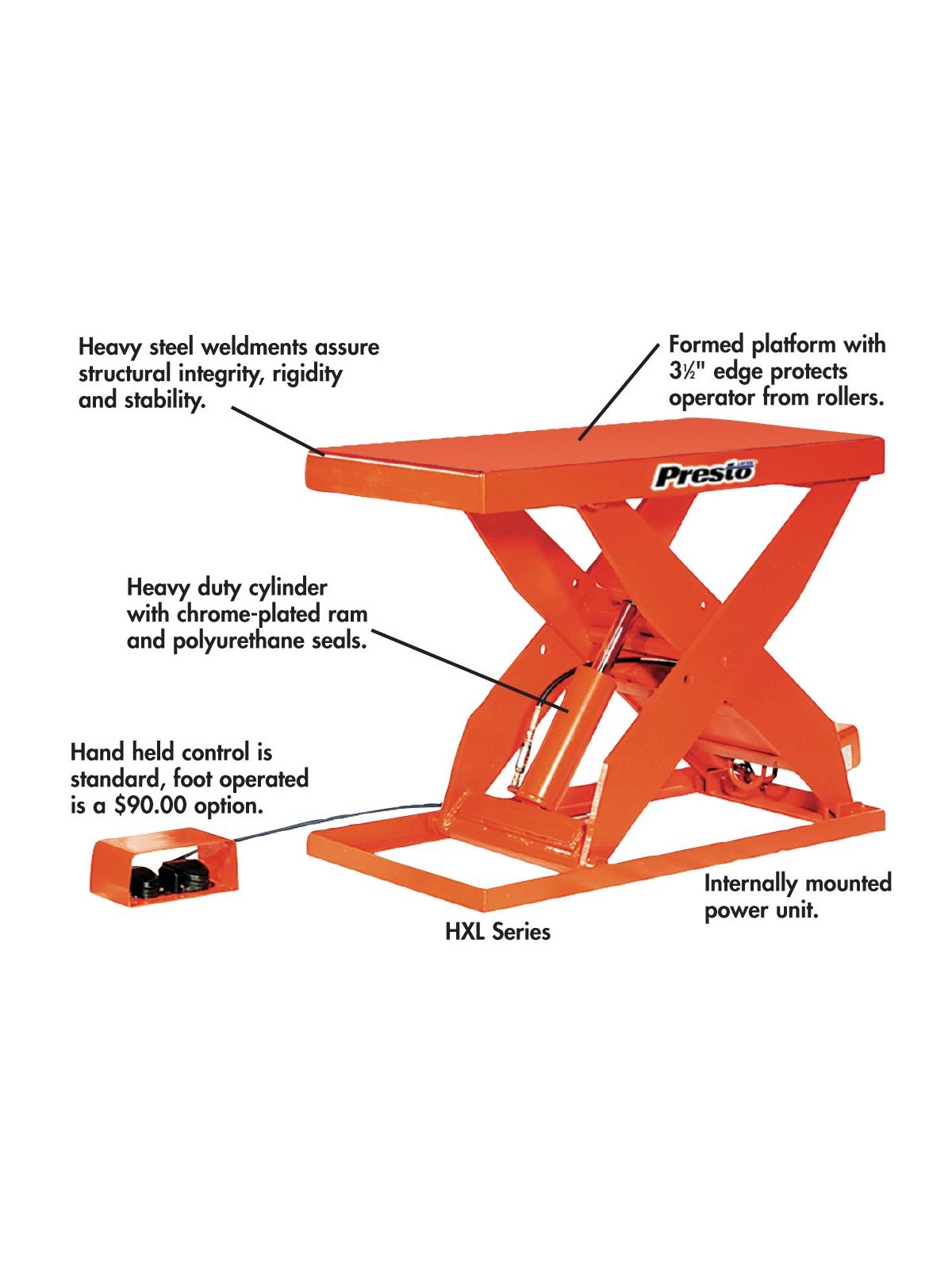 Engineered and designed for smooth, easy operation and durability. Eliminates bending, lifting, and helps prevent back injuries. Industrial-duty construction includes 1/2" plate steel scissor legs, lifetime lubricated bearings, hydraulic cylinders with chrome-plated rams, and polyurethane seals. Hinged top for easy access to internally mounted motor, pumps and oil reservoir. FOB Shipping Point.