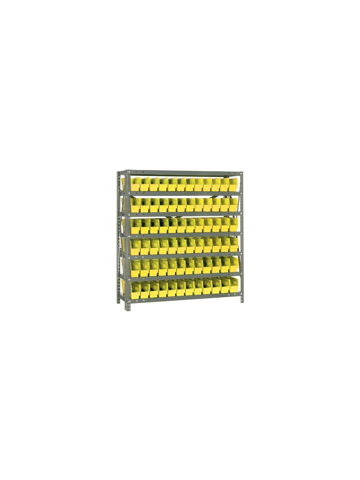 Rugged 350 lb. capacity per shelf, standard shelving unit will keep parts organized and readily accessible. Gray enamel finish will not rust or corrode. 12-HQSB100, 8-HQSB101, 5-HQSB102, 4-HQSB107, 3-HQSB109 fit across a standard 36"W x 12"D shelf. 8-HQSB103, 5-HQSB104, 4-HQSB108, 3-HQSB110 fit across a 36"W x 18"D shelf. Bins are available in Blue, Yellow, Red, Green, Ivory or Black. FOB Shipping Point.