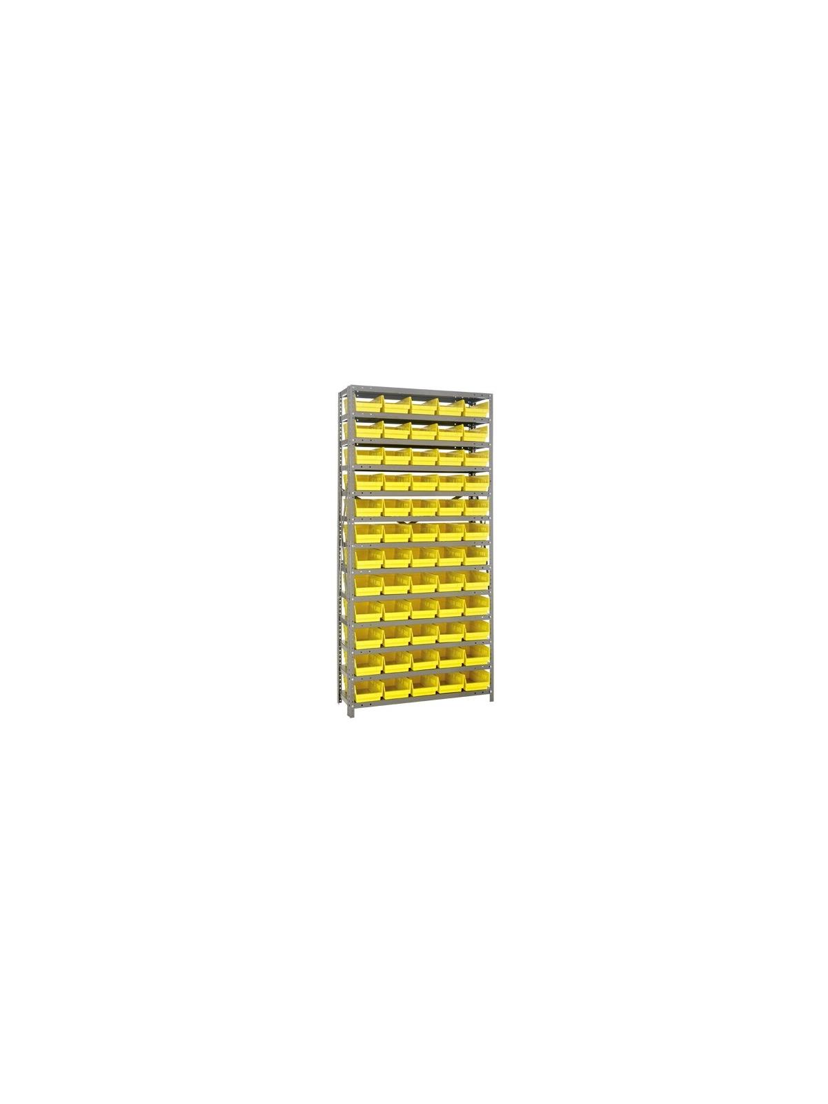 Rugged 350 lb. capacity per shelf, standard shelving unit will keep parts organized and readily accessible. Gray enamel finish will not rust or corrode. 12-HQSB100, 8-HQSB101, 5-HQSB102, 4-HQSB107, 3-HQSB109 fit across a standard 36"W x 12"D shelf. 8-HQSB103, 5-HQSB104, 4-HQSB108, 3-HQSB110 fit across a 36"W x 18"D shelf. Bins are available in Blue, Yellow, Red, Green, Ivory or Black. FOB Shipping Point.