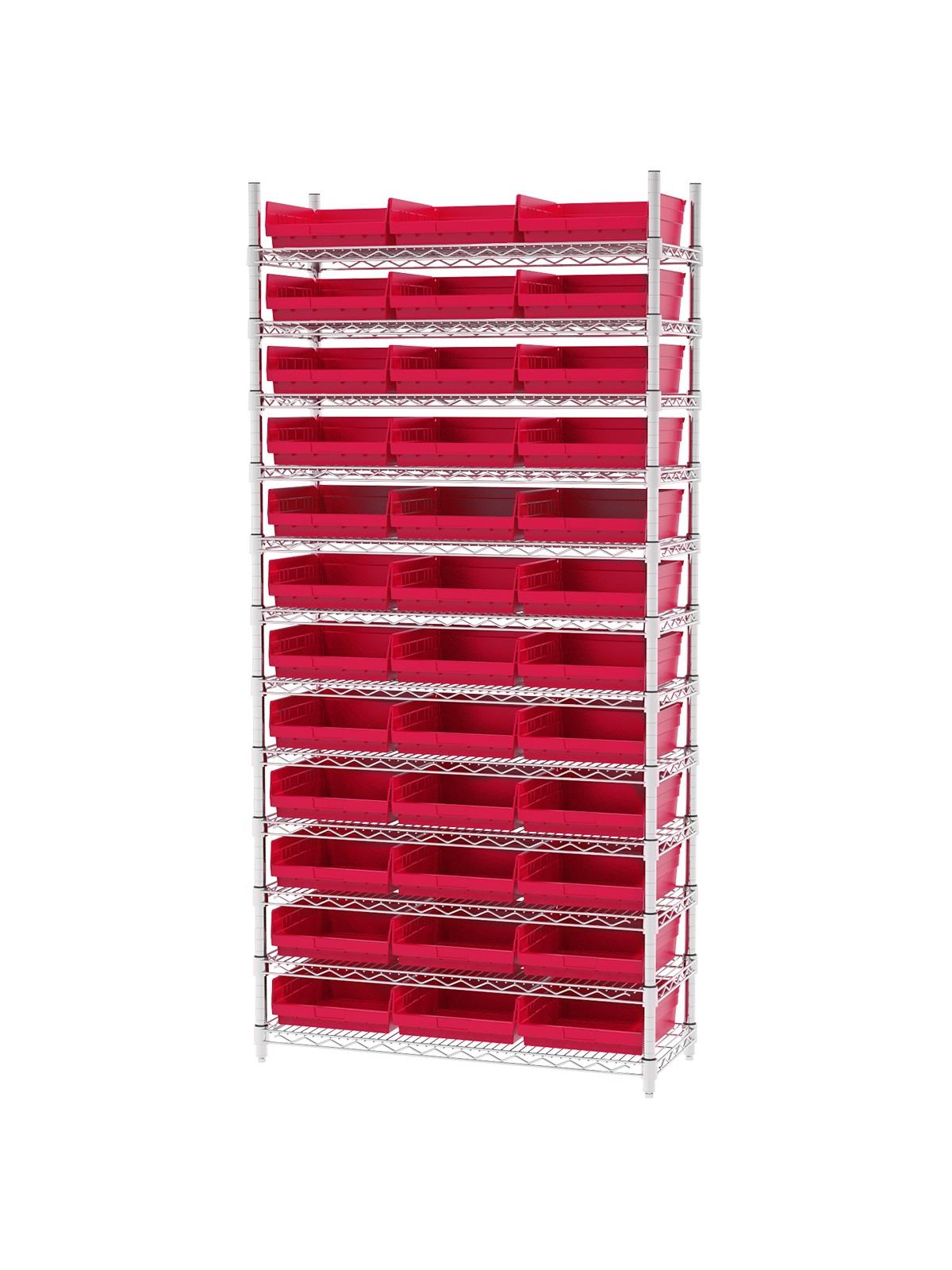 Shelf Bin Wire Systems can be configured for use with 36, 48, 60 or 96 bins providing a versatile system for storage and material handling. Durable and strong polypropylene shelf bins outlast corrugated bins. Bins available in Blue, Red, Yellow, or Semi-Clear. FOB Shipping Point.