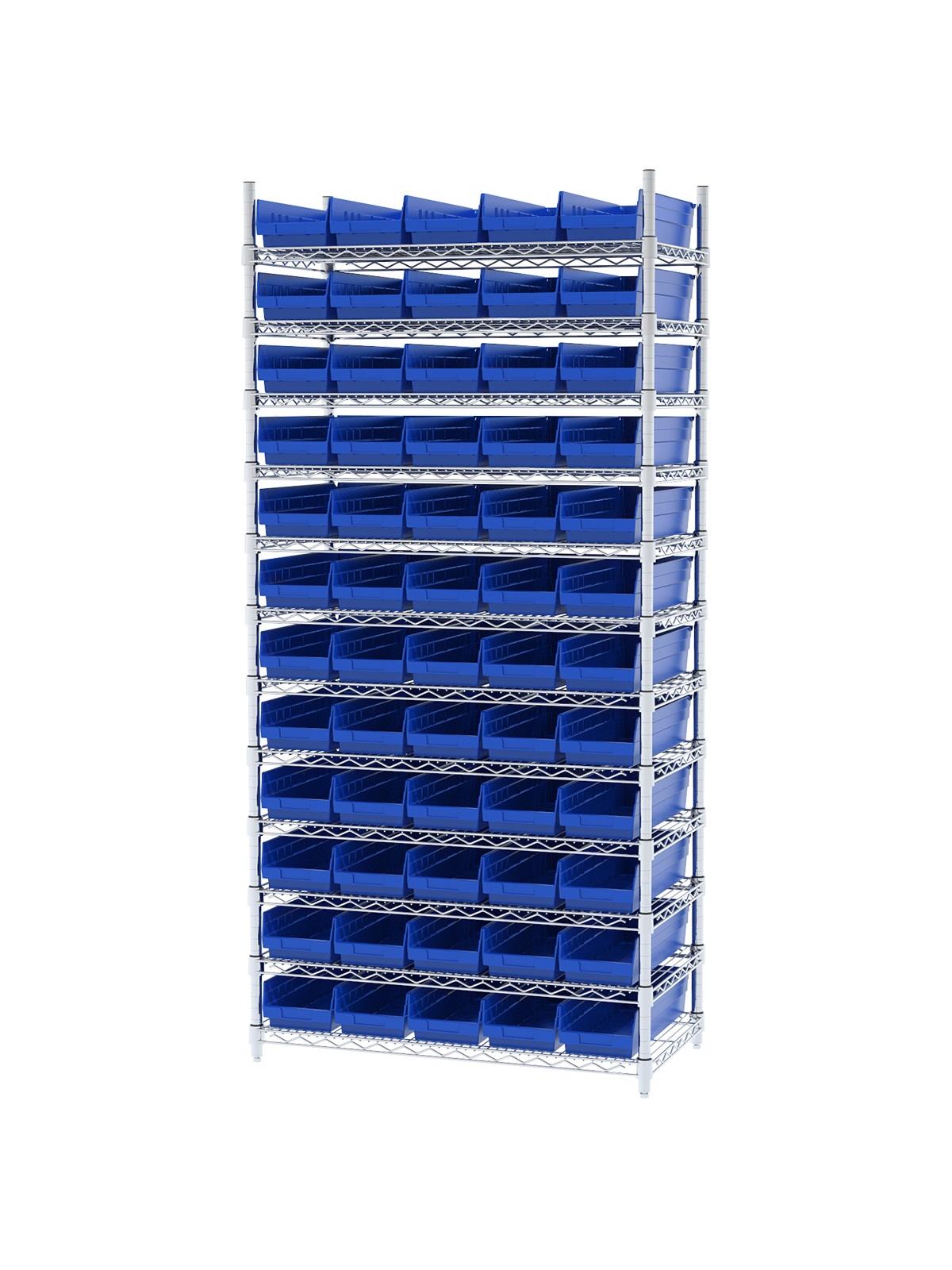 Shelf Bin Wire Systems can be configured for use with 36, 48, 60 or 96 bins providing a versatile system for storage and material handling. Durable and strong polypropylene shelf bins outlast corrugated bins. Bins available in Blue, Red, Yellow, or Semi-Clear. FOB Shipping Point.
