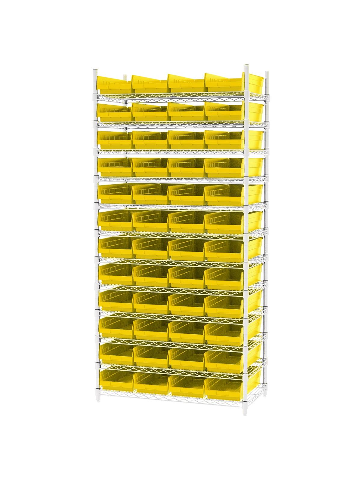 Shelf Bin Wire Systems can be configured for use with 36, 48, 60 or 96 bins providing a versatile system for storage and material handling. Durable and strong polypropylene shelf bins outlast corrugated bins. Bins available in Blue, Red, Yellow, or Semi-Clear. FOB Shipping Point.