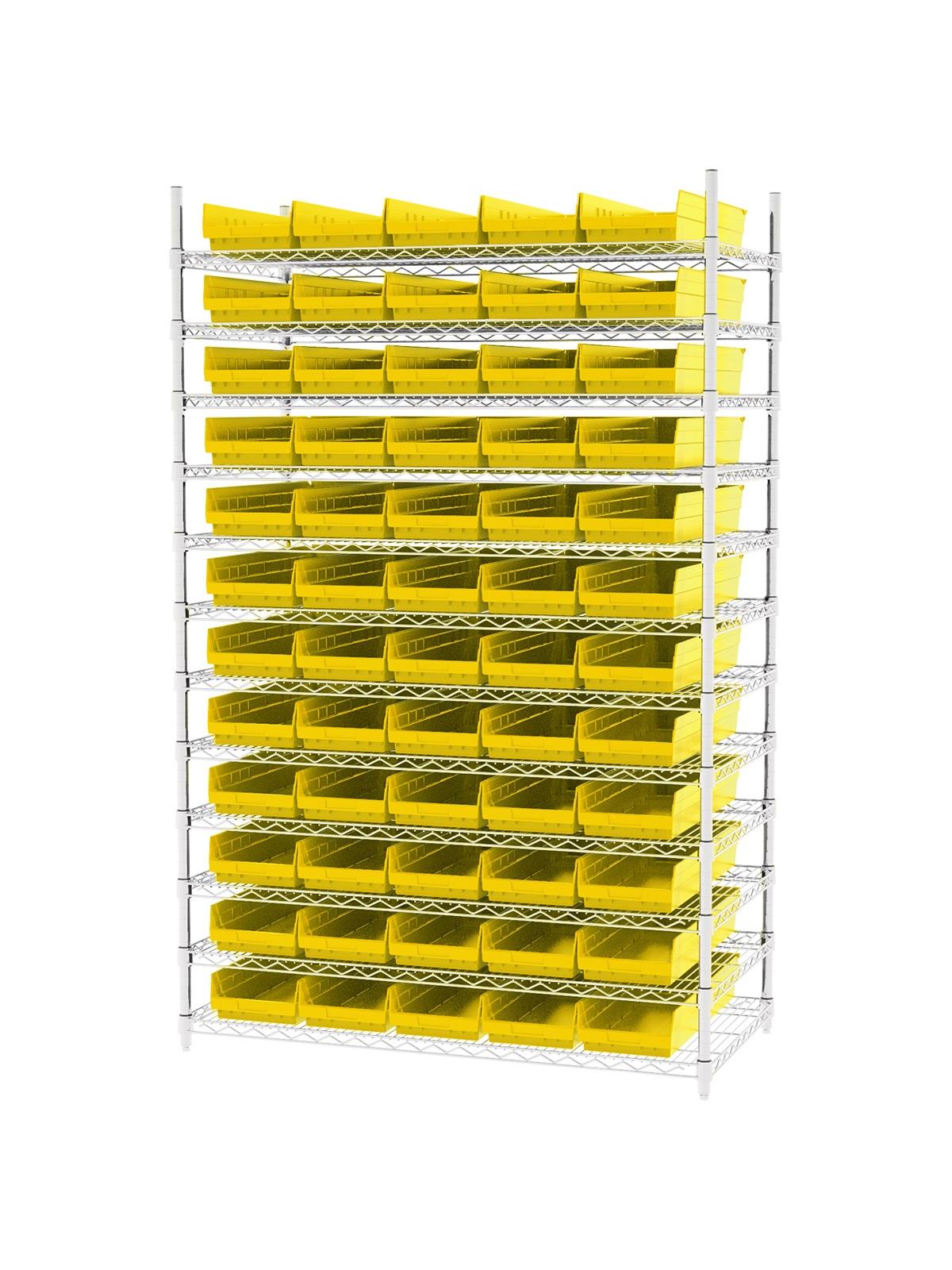 Shelf Bin Wire Systems can be configured for use with 36, 48, 60 or 96 bins providing a versatile system for storage and material handling. Durable and strong polypropylene shelf bins outlast corrugated bins. Bins available in Blue, Red, Yellow, or Semi-Clear. FOB Shipping Point. WIRE SHELVING ADVANTAGES: