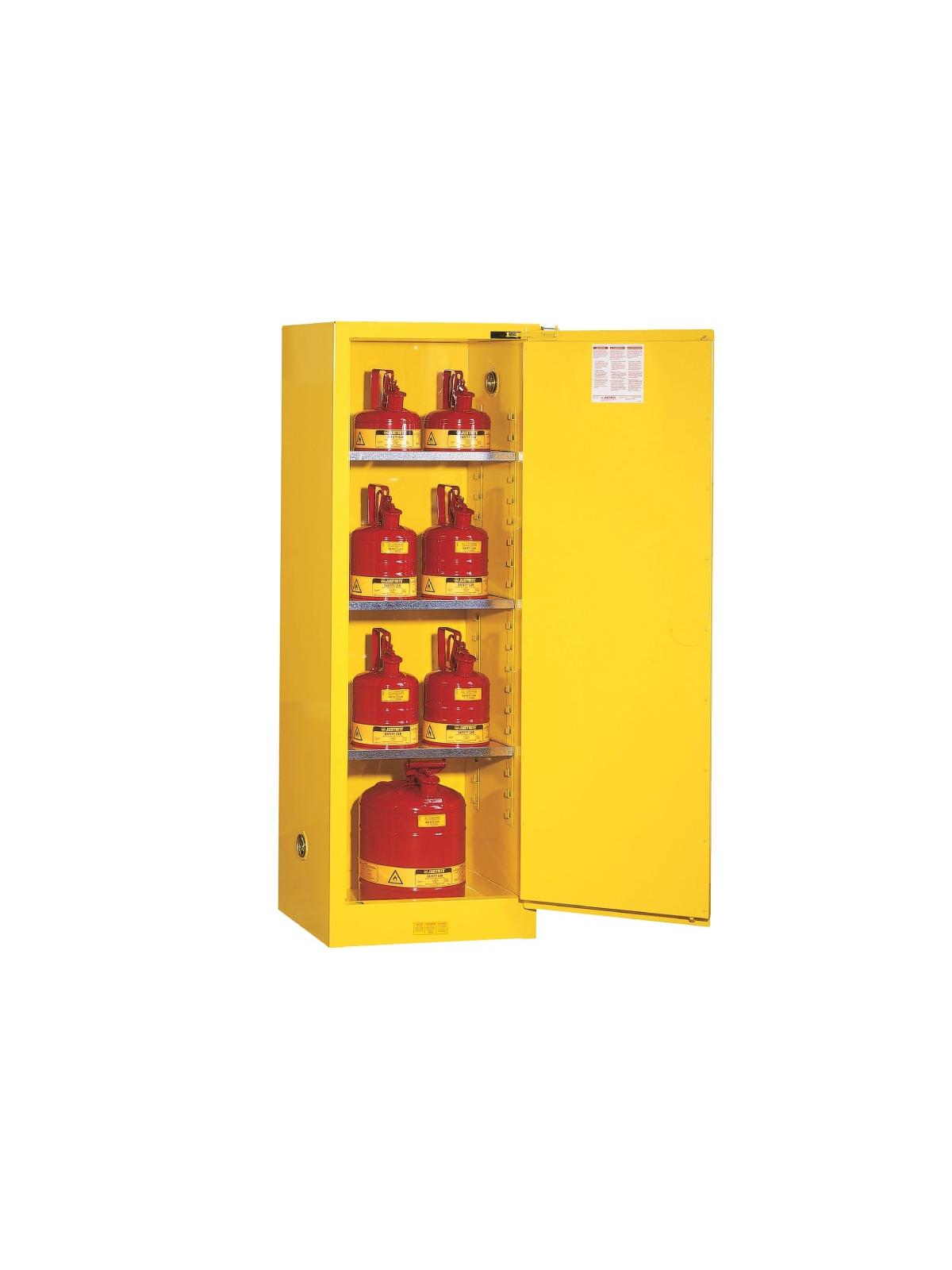 Where workspace is a premium, Slimline is the answer. Features sturdy 18 ga. welded steel, double door construction with OSHA compliant 1-1/2" insulating air space to ensure maximum fire resistance. This 22 gallon capacity cabinet has all the advantages of a larger cabinet in a compact design. Sure-Grip® handle -- self latching paddle style handle offers easy fingertip access to contents. Exclusive gripper pad provides secure hold.  FOB Shipping Point.