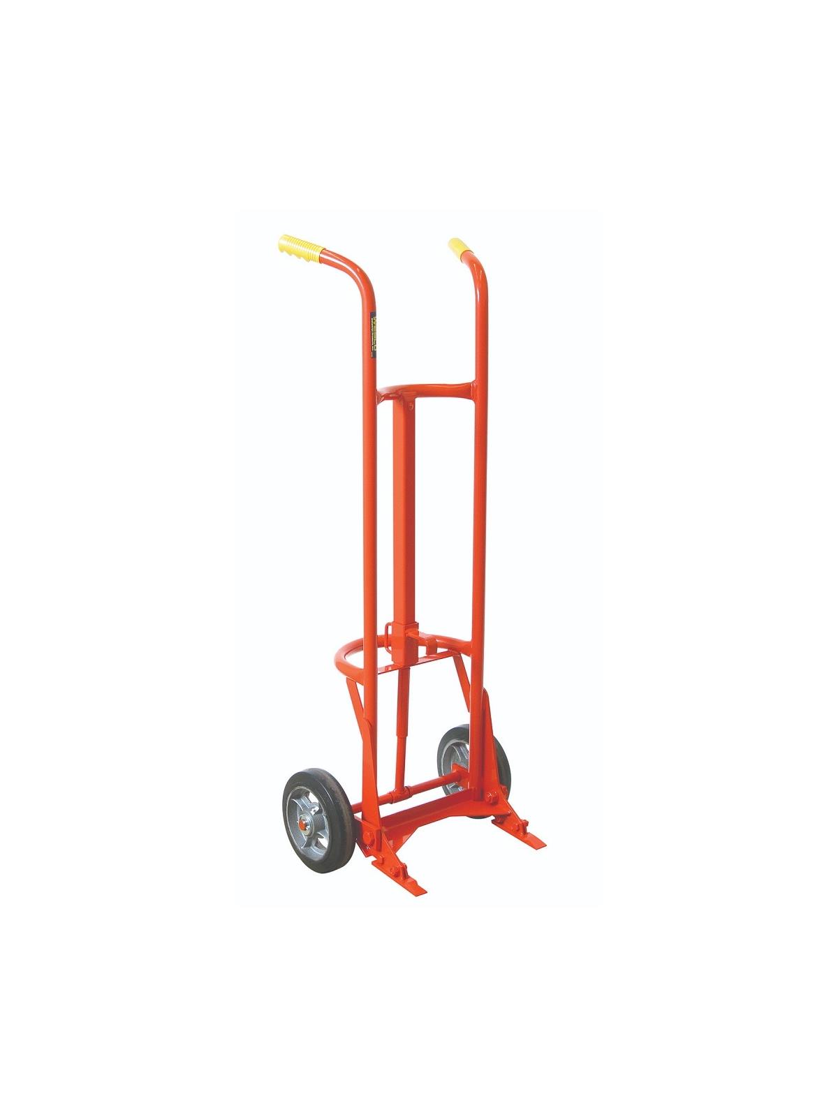 Machined steel load wheels behind nose prong help ease the lifting of drum. Classic single bar frame design. Kickstand. 24"W. at handle. 16.25"W. at nose.