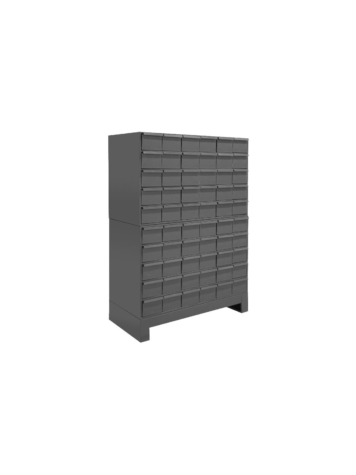 Full-width handle drawers open easily thanks to two embossed runners.  Positive stop prevents spilling. Each drawer comes with 2 dividers. Shipped assembled. Includes base. Gray powder coat finish. FOB Shipping Point.
