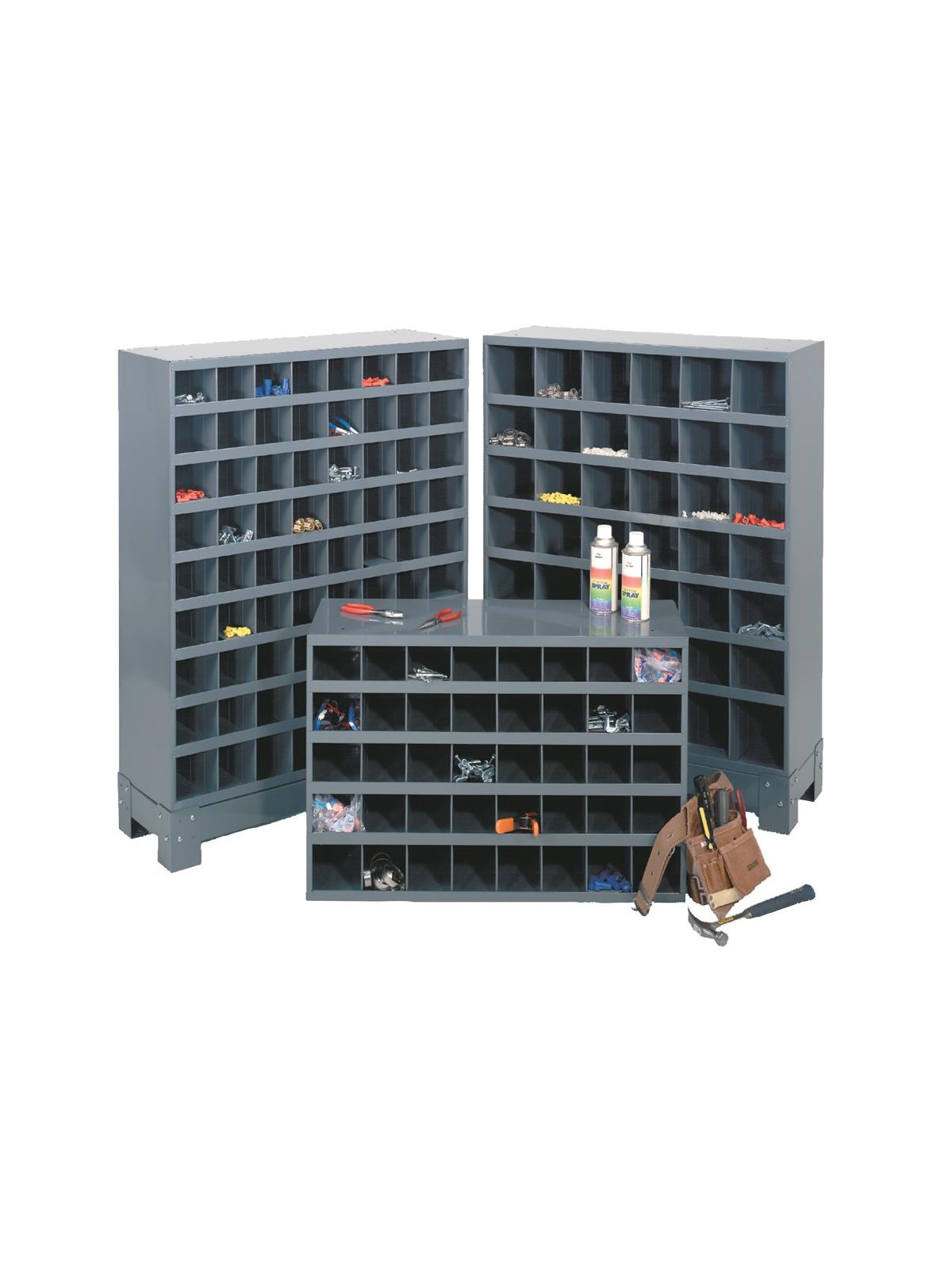Roll-formed sides for increased strength and stability. Newly redesigned slope shelves. Ribbed and hemmed dividers provide added strength. Optional base available. Ships fully assembled ready for use. Durable gray powder coat finish. FOB Shipping Point.