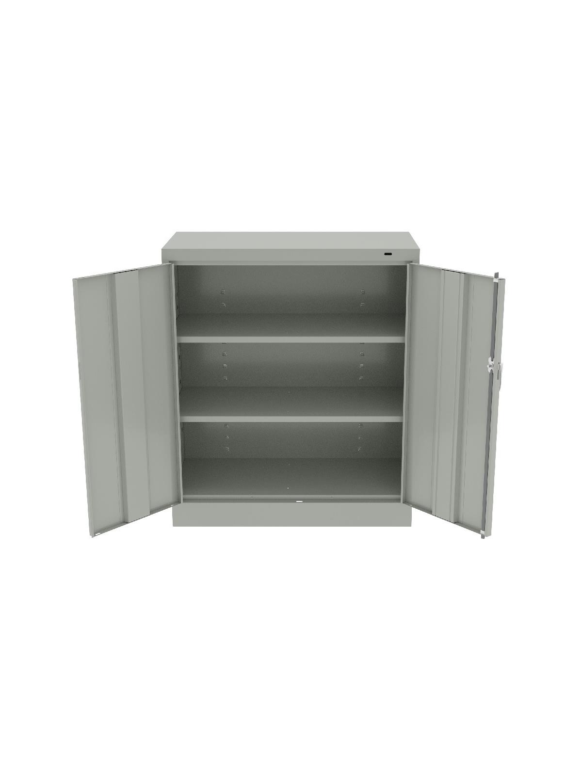 Knuckle hinges on each door insure the integrity of the cabinet and the alignment of the doors. Doors are reinforced for strength and quietness. Handle on right-hand door activates a 3-point system for added security; dummy handle on left-hand door. Shelves are adjustable in 2" increments on built-in shelf tabs. Shelves will hold up to 200 lbs. evenly distributed. Two front leveling glides compensate for uneven floors. Louvered back panel allows air circulation in the cabinet. Available in four models--storage, wardrobe, combination, and counter high cabinets. Available in Black, Champagne/Putty, Sand, Light Gray and Medium Gray. FOB Shipping Point.