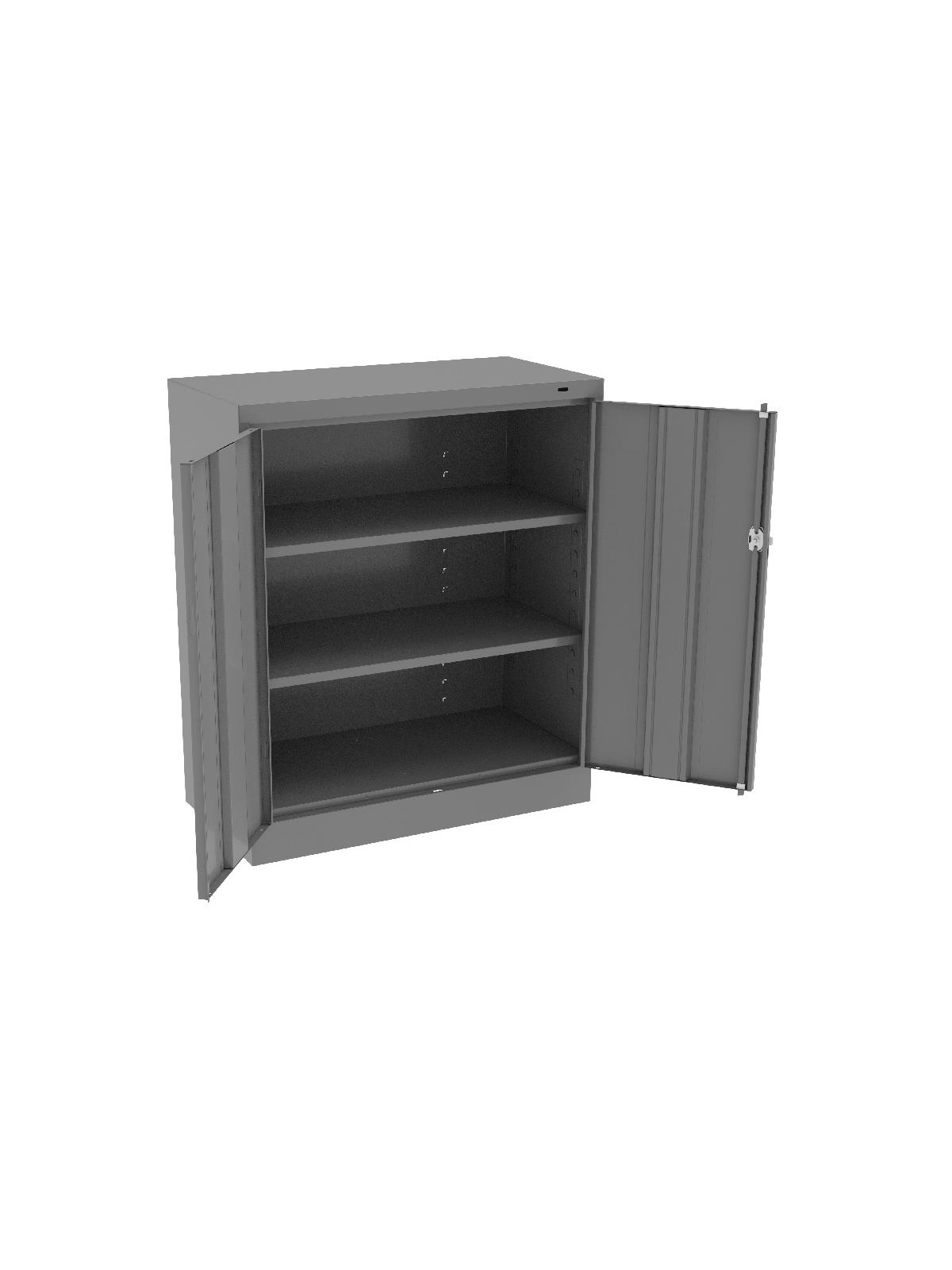 Knuckle hinges on each door insure the integrity of the cabinet and the alignment of the doors. Doors are reinforced for strength and quietness. Handle on right-hand door activates a 3-point system for added security; dummy handle on left-hand door. Shelves are adjustable in 2" increments on built-in shelf tabs. Shelves will hold up to 200 lbs. evenly distributed. Two front leveling glides compensate for uneven floors. Louvered back panel allows air circulation in the cabinet. Available in four models--storage, wardrobe, combination, and counter high cabinets. Available in Black, Champagne/Putty, Sand, Light Gray and Medium Gray. FOB Shipping Point.
