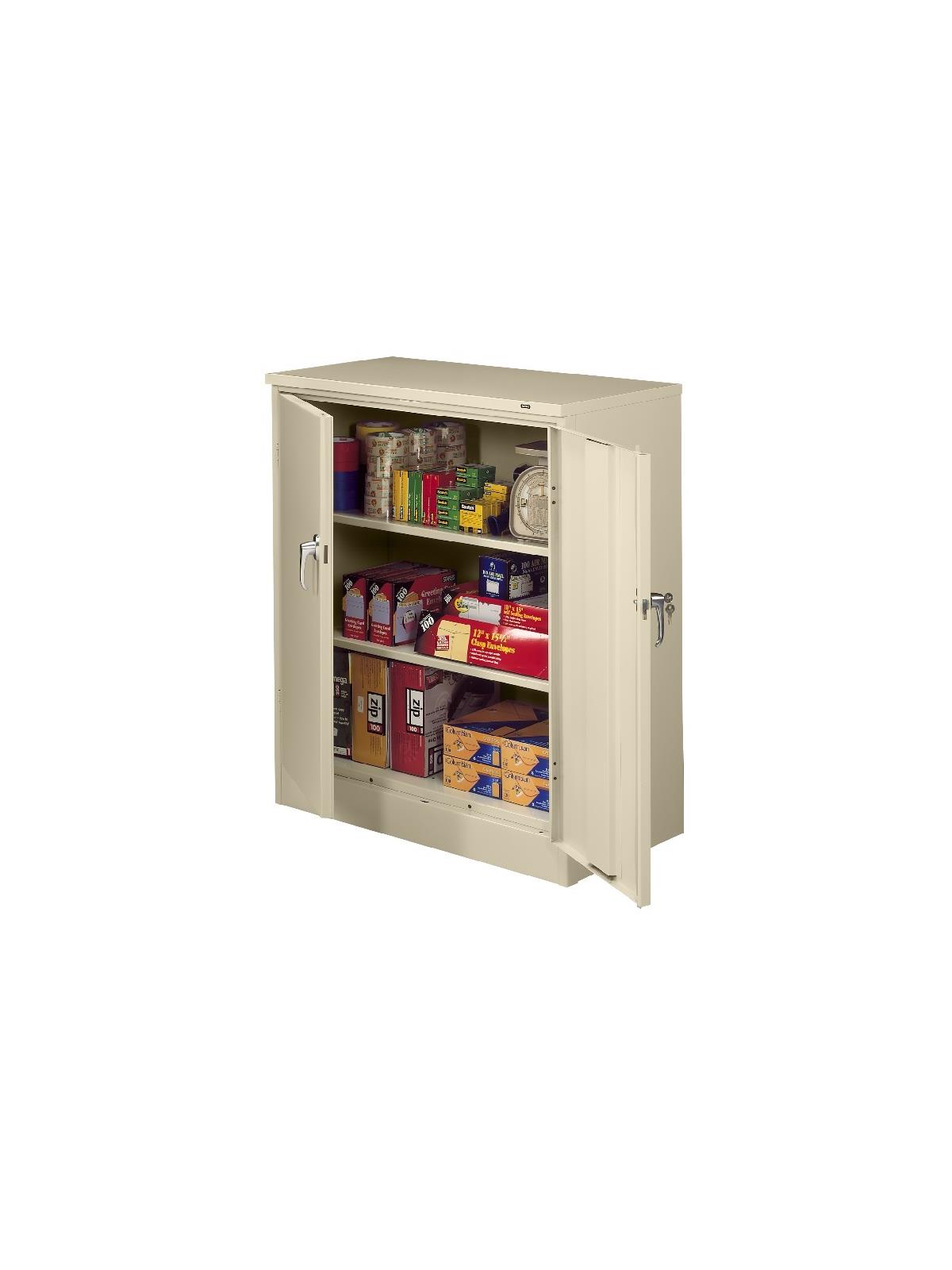 Knuckle hinges on each door insure the integrity of the cabinet and the alignment of the doors. Doors are reinforced for strength and quietness. Handle on right-hand door activates a 3-point system for added security; dummy handle on left-hand door. Shelves are adjustable in 2" increments on built-in shelf tabs. Shelves will hold up to 200 lbs. evenly distributed. Two front leveling glides compensate for uneven floors. Louvered back panel allows air circulation in the cabinet. Available in four models--storage, wardrobe, combination, and counter high cabinets. Available in Black, Champagne/Putty, Sand, Light Gray and Medium Gray. FOB Shipping Point.