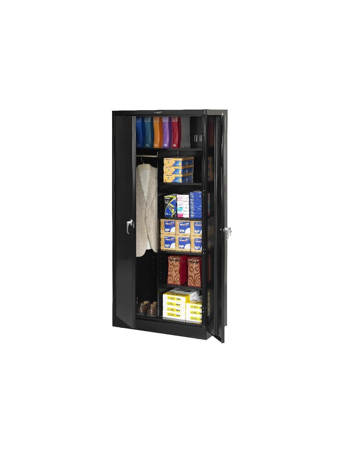 Knuckle hinges on each door insure the integrity of the cabinet and the alignment of the doors. Doors are reinforced for strength and quietness. Handle on right-hand door activates a 3-point system for added security; dummy handle on left-hand door. Shelves are adjustable in 2" increments on built-in shelf tabs. Shelves will hold up to 200 lbs. evenly distributed. Two front leveling glides compensate for uneven floors. Louvered back panel allows air circulation in the cabinet. Available in four models--storage, wardrobe, combination, and counter high cabinets. Available in Black, Champagne/Putty, Sand, Light Gray and Medium Gray. FOB Shipping Point.