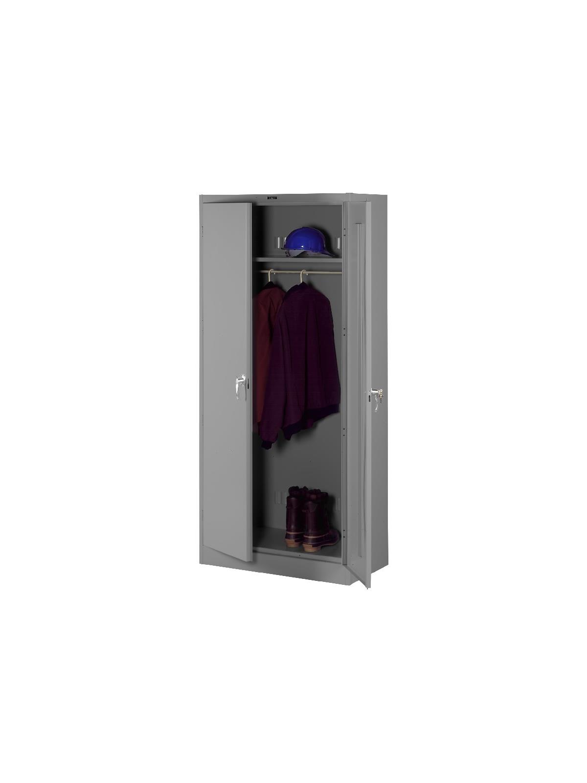 Knuckle hinges on each door insure the integrity of the cabinet and the alignment of the doors. Doors are reinforced for strength and quietness. Handle on right-hand door activates a 3-point system for added security; dummy handle on left-hand door. Shelves are adjustable in 2" increments on built-in shelf tabs. Shelves will hold up to 200 lbs. evenly distributed. Two front leveling glides compensate for uneven floors. Louvered back panel allows air circulation in the cabinet. Available in four models--storage, wardrobe, combination, and counter high cabinets. Available in Black, Champagne/Putty, Sand, Light Gray and Medium Gray. FOB Shipping Point.