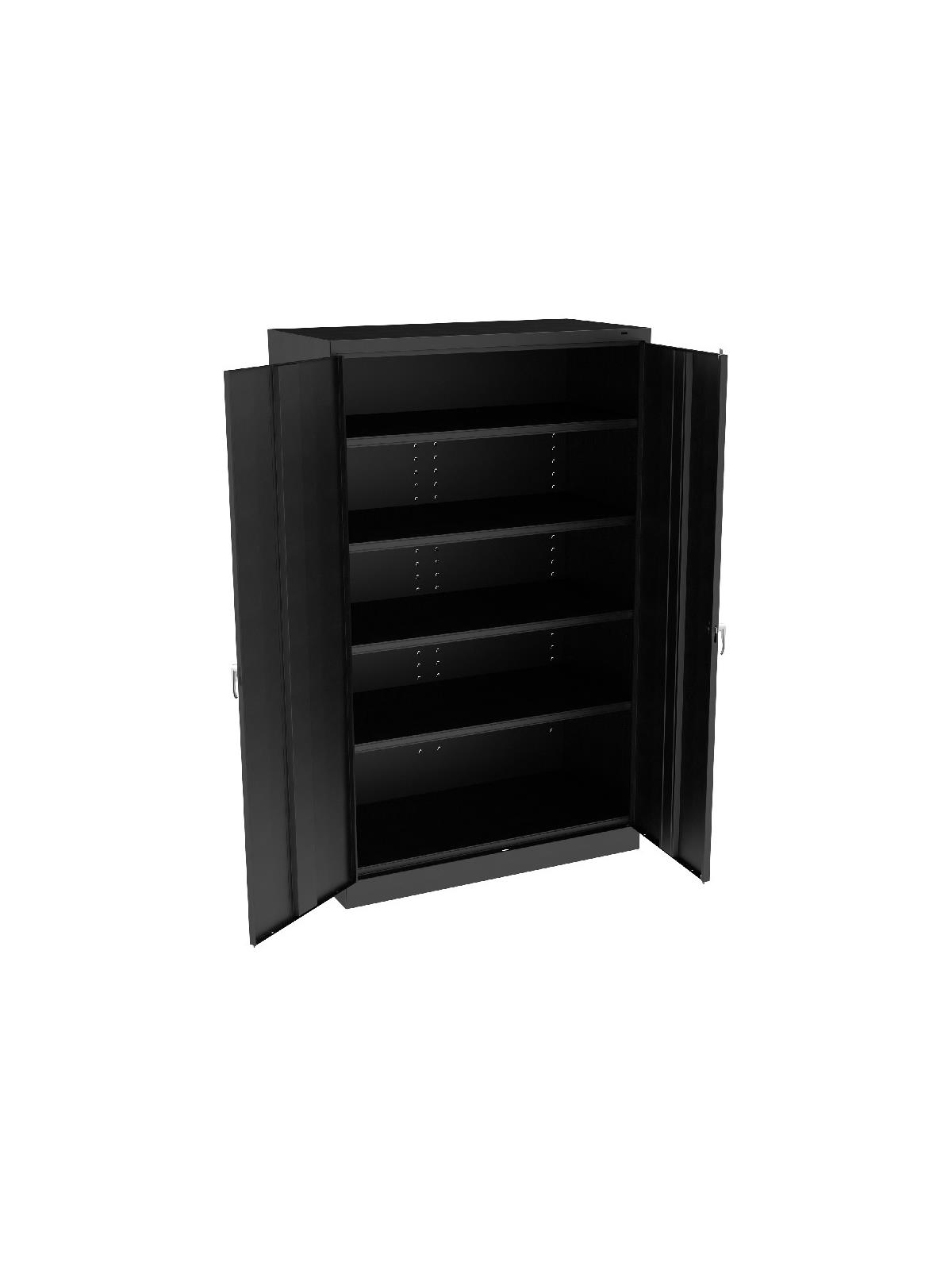 Jumbo size for jumbo storage capacity. Two front leveling glides compensate for uneven floors. Four leaf hinges on each door insure the integrity of the cabinet and the alignment of the doors. Handle on right-hand door activates a three-point locking system for added security -- second handle on left-hand door. Shelves are adjustable in 2" increments on built-in shelf tabs. Shelves hold up to 400 lbs. evenly distributed. Unassembled cabinets ship in 2 cartons. Available in Black, Champagne/Putty, Sand, Light Gray and Medium Gray. FOB Shipping Point.