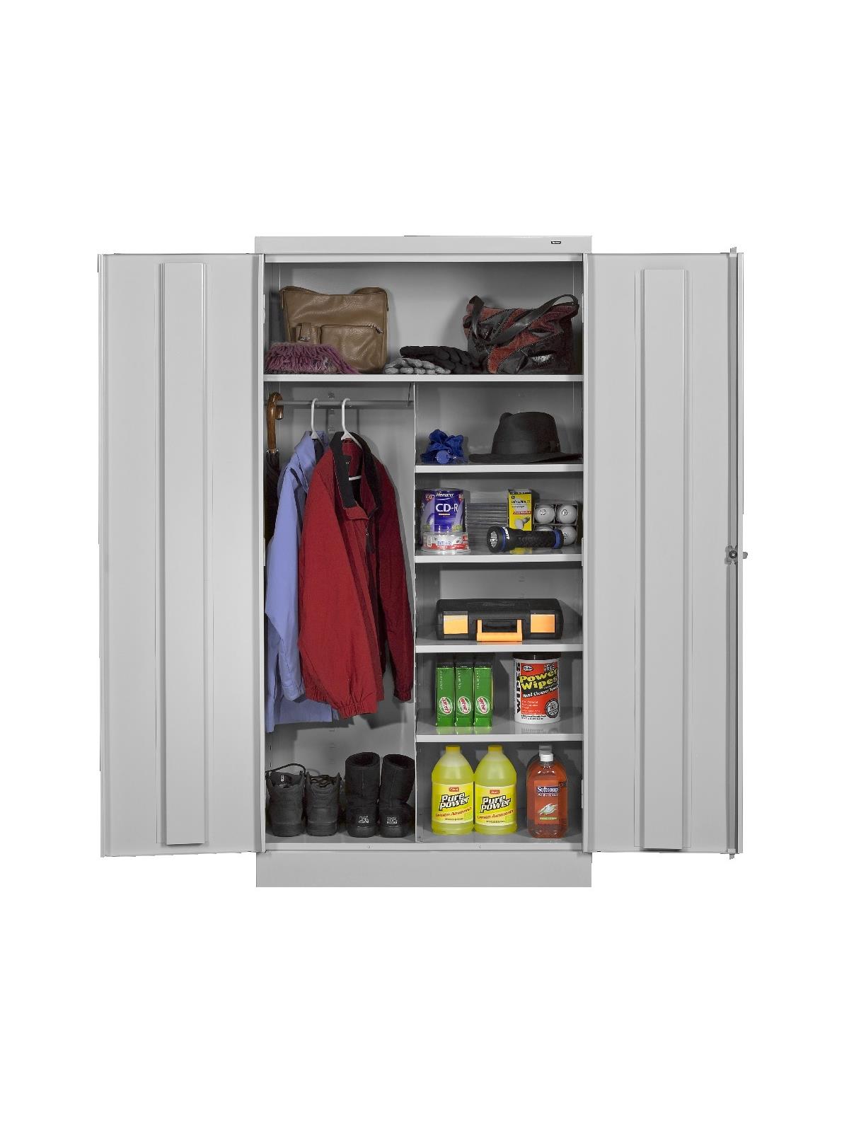 Shelves adjust in 2" increments. Heavy-steel construction with leaf hinges and reinforced doors stand up to a lifetime of heavy use. Handle on right-hand door activates the three-point locking system to keep belongings secure. Raised base keeps contents from contacting moisture from the floor. Available in 3 models--storage, wardrobe and combination. Available in Black, Champagne/Putty, Sand, Light Gray and Medium Gray. FOB Shipping Point.