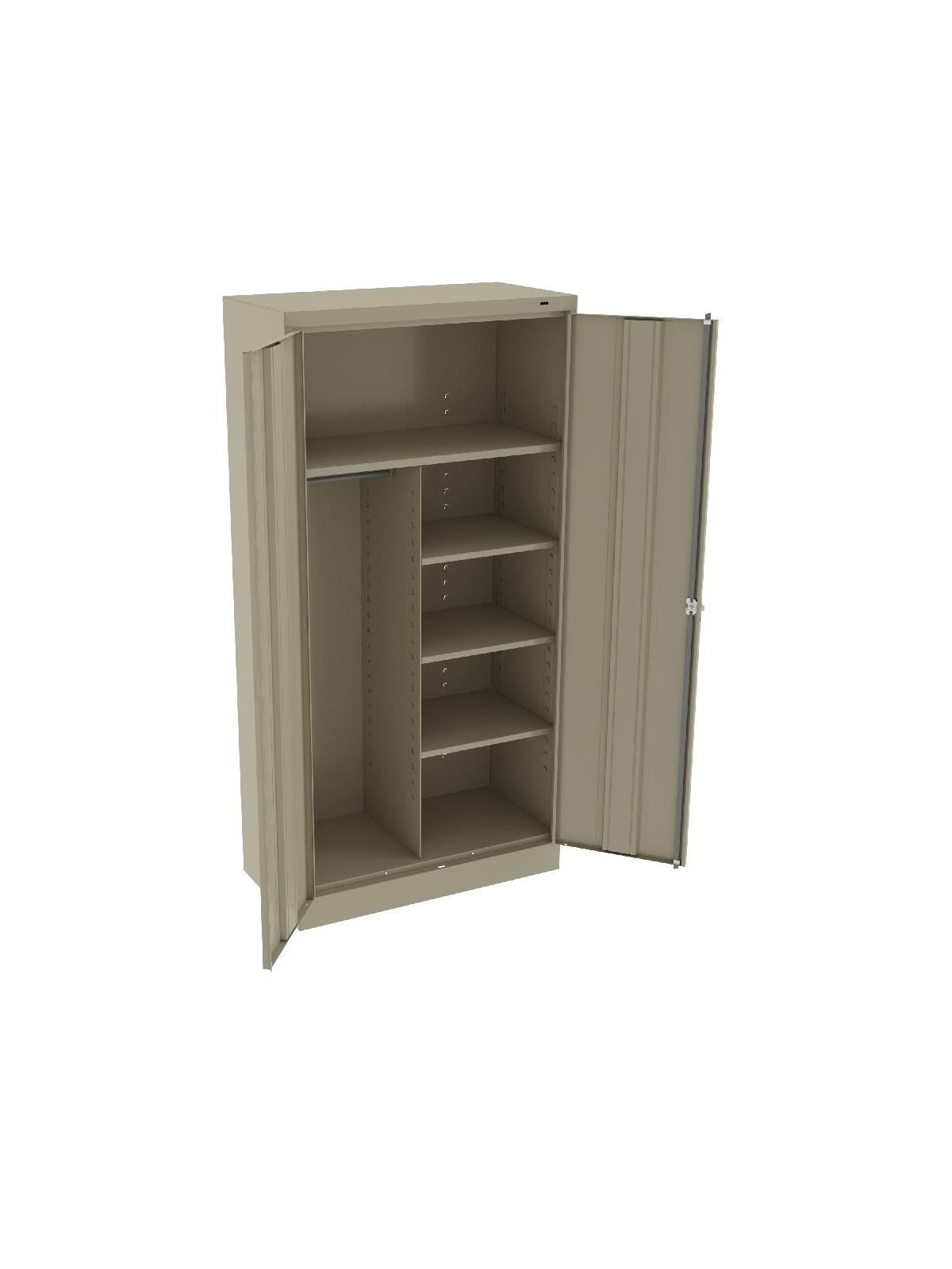 Shelves adjust in 2" increments. Heavy-steel construction with leaf hinges and reinforced doors stand up to a lifetime of heavy use. Handle on right-hand door activates the three-point locking system to keep belongings secure. Raised base keeps contents from contacting moisture from the floor. Available in 3 models--storage, wardrobe and combination. Available in Black, Champagne/Putty, Sand, Light Gray and Medium Gray. FOB Shipping Point.