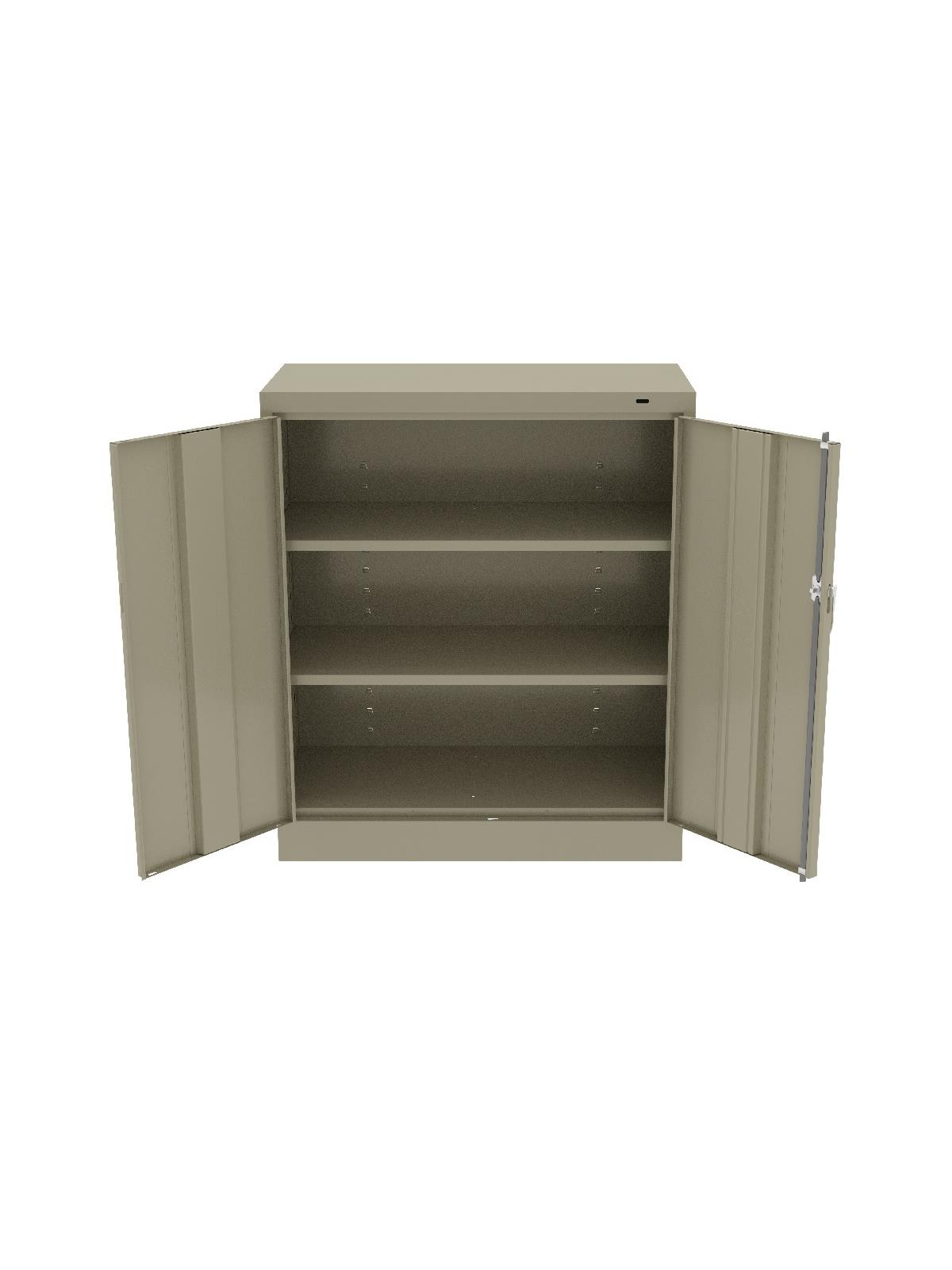 Shelves adjust in 2" increments. Heavy-steel construction with leaf hinges and reinforced doors stand up to a lifetime of heavy use. Handle on right-hand door activates the three-point locking system to keep belongings secure. Raised base keeps contents from contacting moisture from the floor. Available in Black, Champagne/Putty (shown), Sand, Light Gray and Medium Gray (shown). FOB Shipping Point.