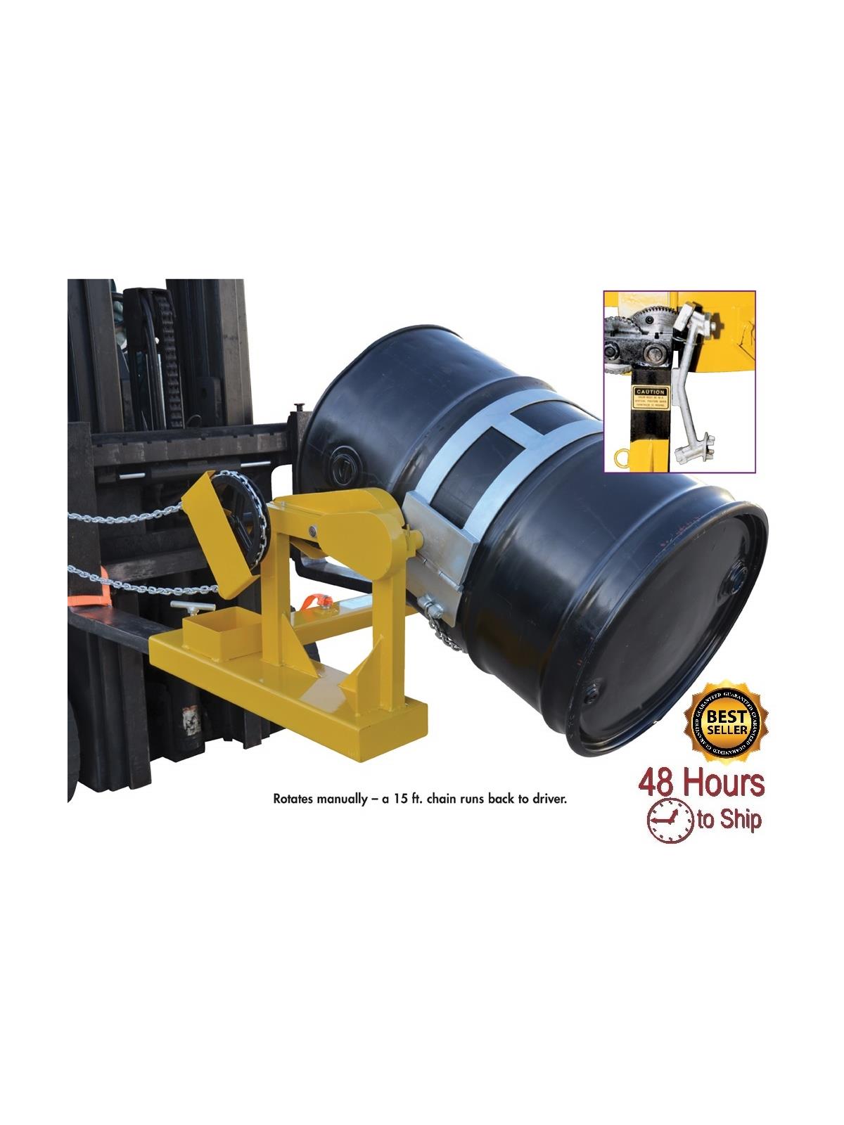 Safety restraint securely attaches to forklift. Drums must be full to rotate at rated capacity. Fork pockets measure 7"W x 2-5/8"H I.D. on 31-3/8" centers. Rotates manually - a 15' chain runs back to driver. FOB Shipping Point. Due to tariffs and market conditions, pricing subject to change.