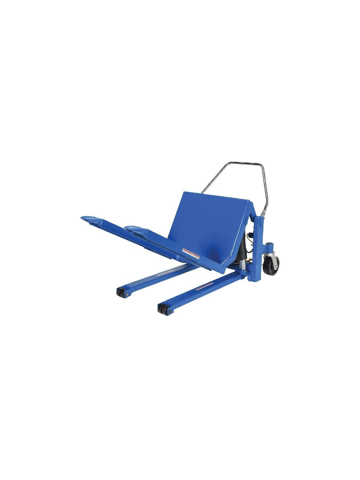 Lift and position filled tote boxes or baskets without the need of a fork truck or lift table using the newly designed heavy-duty Tilt Master. These 90 degree tilters will function as a transporter by moving completed products from work station to work station without waiting for a fork truck. A folding ergonomic handle has dual steering grips for quick and easy maneuverability. Unit has a thin profile to allow the user to get as close to the load as possible. Units roll easily on 8" x 3" phenolic steering wheels and feature a floor lock. Series TM are to be used with open bottom pallets or skids only while the Tilt Master Straddle units, series TMS, can be used with virtually any kind of container or pallet. Units are powered with a 12V DC electric motor including an on-board battery charger standard. AC or *AIR/OIL power units available contact factory (*filter - regulator - lubricator required). Comes standard with a push-button hand control on an 8 foot coil cord. Battery Charge Indicator Gauge now standard. FOB Shipping Point.