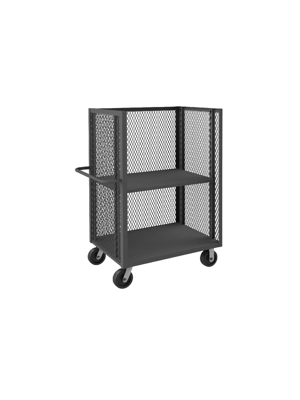 Three sided design keeps contents secure and in place - while allowing easy accessibility. Constructed of 14 ga. cold rolled steel. Expanded metal sides and back. Durable steel construction supports loads up to 2000 lbs. Base has lip-up for product retention. Features convenient push handle. Easy, smooth rolling on 6" x 2" phenolic bolt-on casters - 2 swivel, 2 rigid. Casters are 2,000 lb. capacity. Sides and back extend 48" above deck. Durable Gray powder coat finish. Includes one adjustable shelf. FOB Shipping Point.