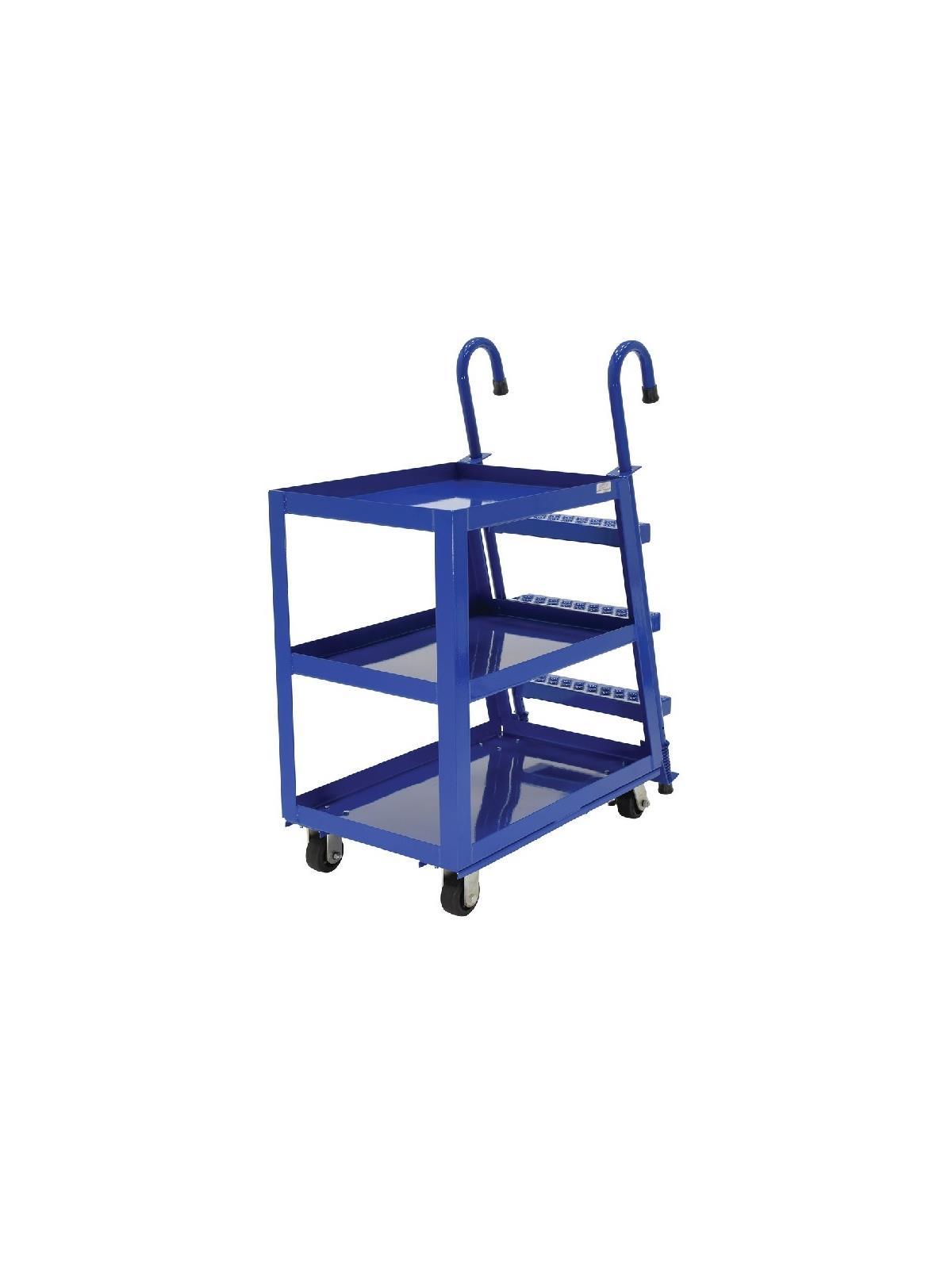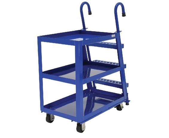 Stockpicker Trucks combine the mobility of a cart with the versatility of a steel step ladder. Spring loaded steel step ladder holds the cart securely in place while a person is standing on the ladder. Shelves have a 2" lip turned up. 4" x 1-1/2" mold-on rubber casters two (2) rigid and two (2) swivel with wheel brakes. Blue baked-in powder-coat finish for added toughness. Aluminum construction available. FOB Shipping Point.