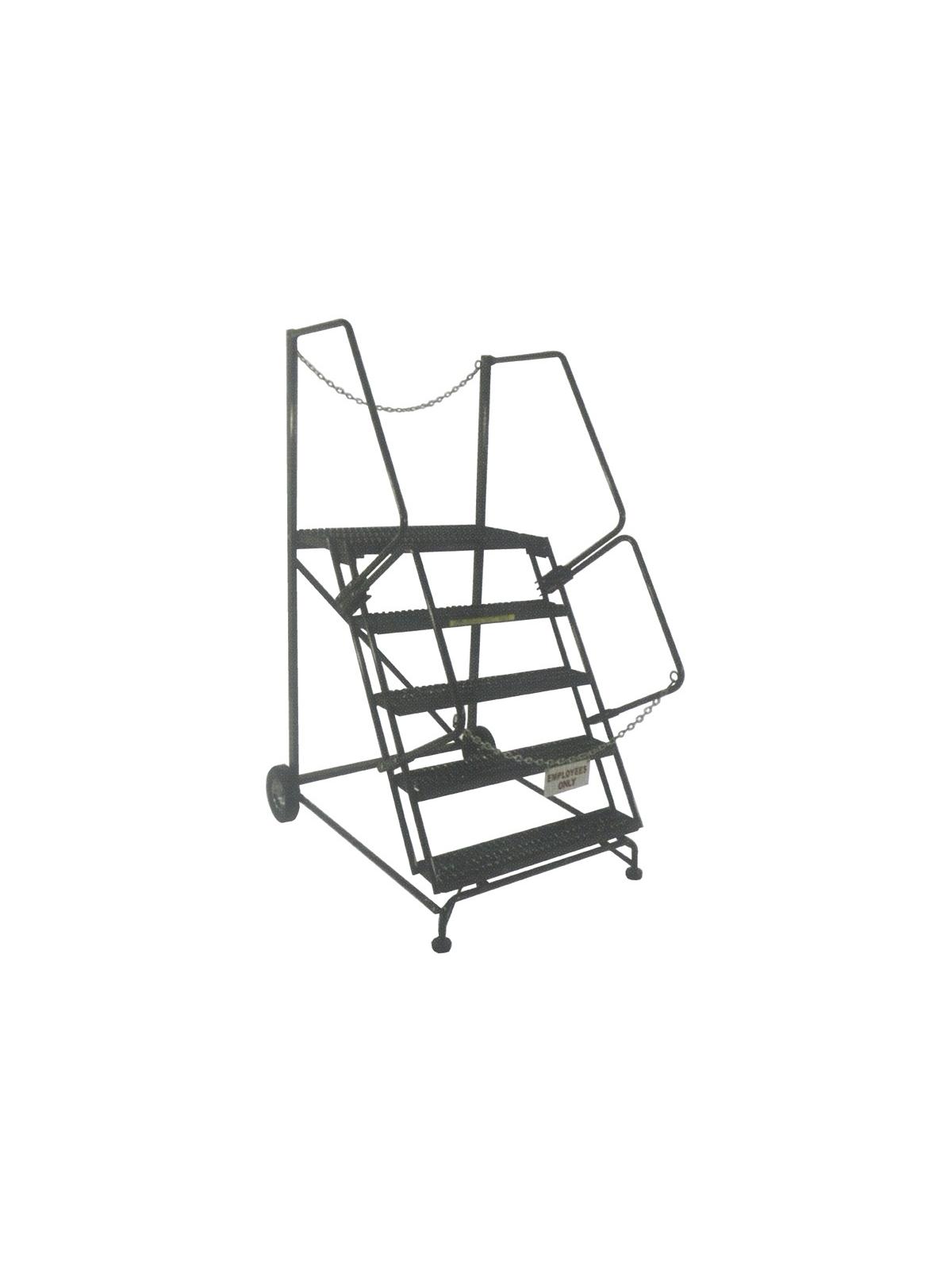 No rear guardrail is standard for easy walk through (includes snap chain). Heavy duty serrated grating tread for added safety. Rolls easily on 10" rubber wheels. Available in both 59° ladder slope or gradual 50° stairway slope. 450 lb. capacity. Built to OSHA and ANSI standards. Gray powder coat finish. FOB Shipping Point.