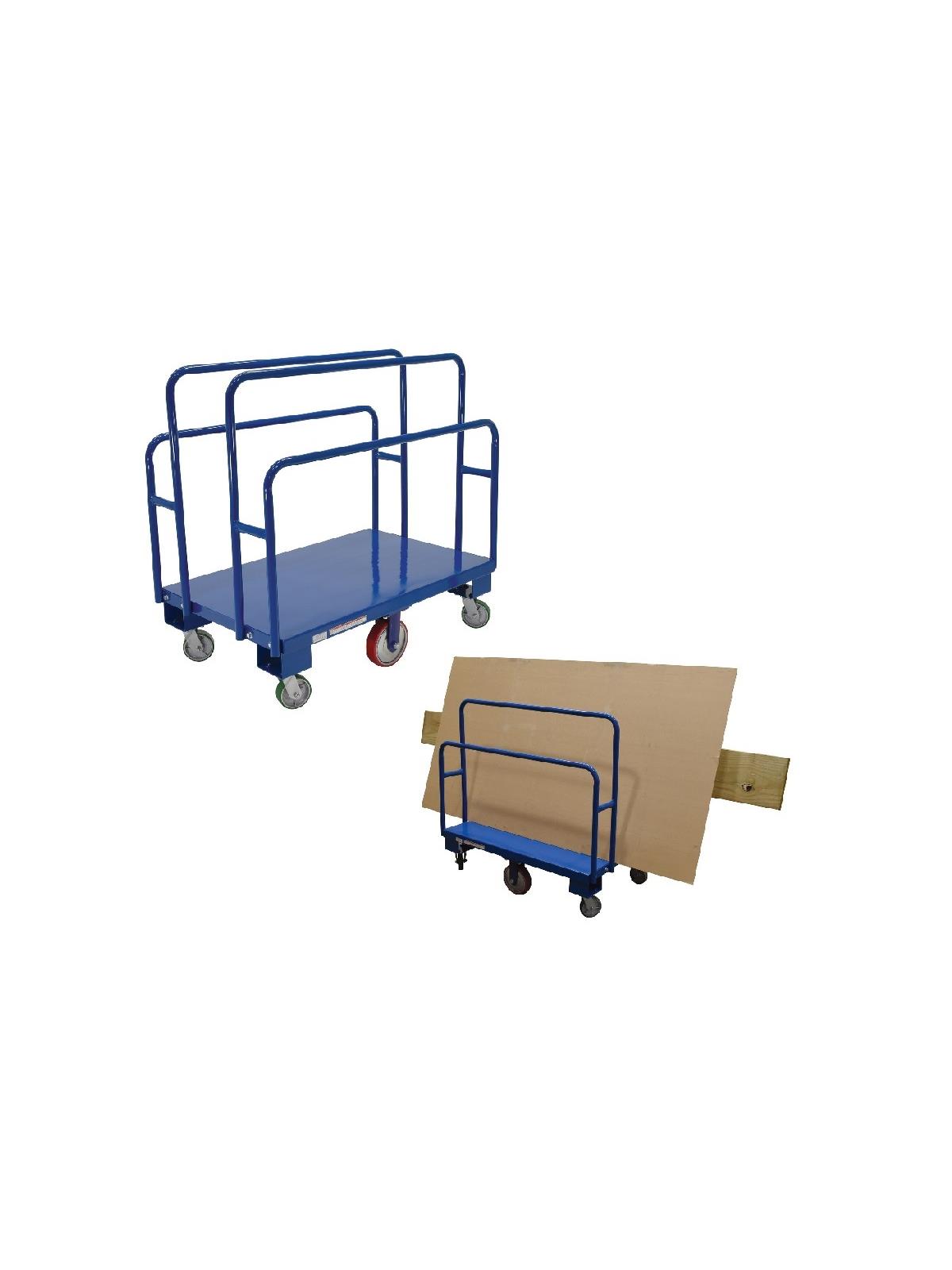 Heavy duty steel platform cart supports multiple sizes of sheet material such as paneling, plywood, drywall or anything that is long, bulky and hard to handle. Ideal for lumberyards and hardware stores. Rolls on (4) 5" x 1-1/2" swivel poly-on-steel and (2) 8" x 2" rigid poly-on-steel casters. Center caster provides great maneuverability. FOB Shipping Point.