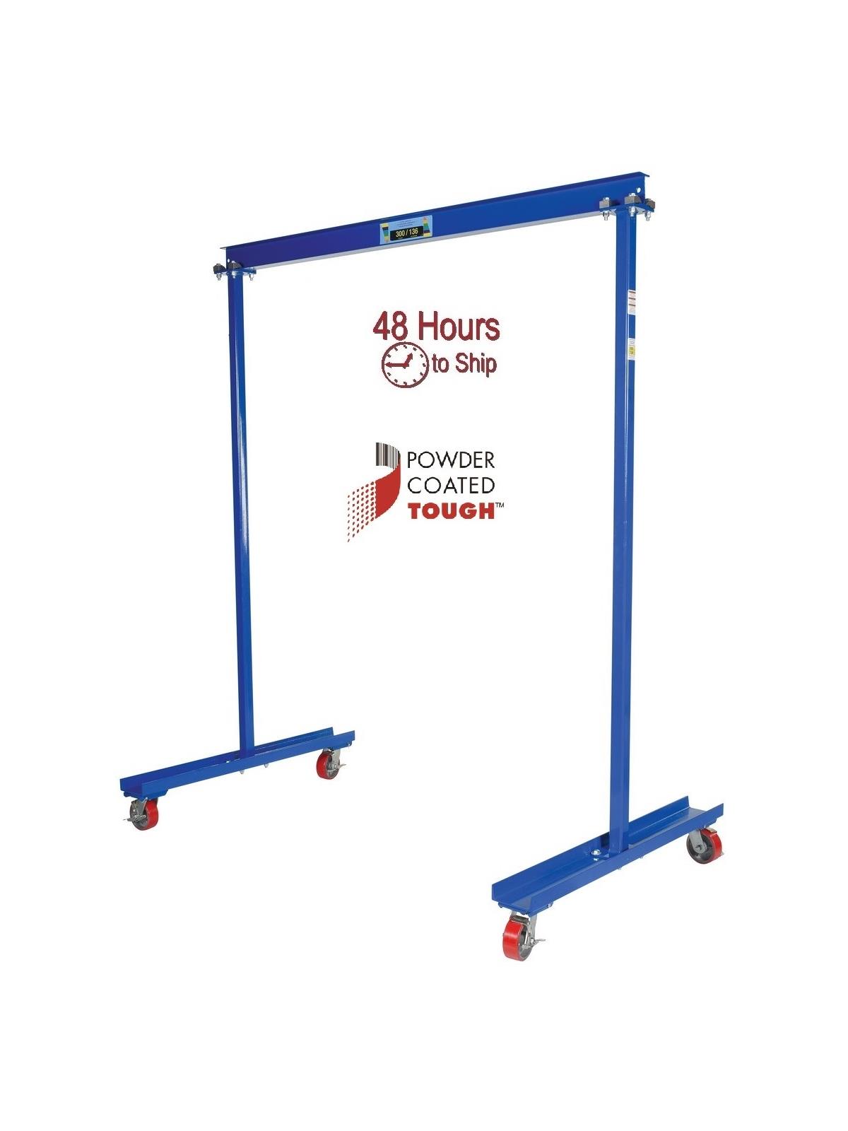 Lightweight fixed height design allows for easy mobility. Includes (4) 5" x 2" poly-on-steel swivel casters with brake. Overall I-beam length is 79-3/4". Do not move units while loaded. Steel construction with blue baked in powder coat finish for added toughness. Bolt together installation. Hoist and trolley sold separately. FOB Shipping Point.