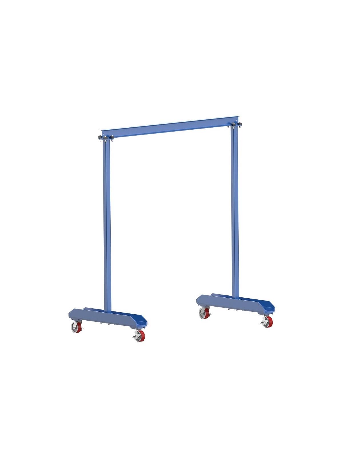 Lightweight fixed height design allows for easy mobility. Includes (4) 5" x 2" poly-on-steel swivel casters with brake. Overall I-beam length is 79-3/4". Do not move units while loaded. Steel construction with blue baked in powder coat finish for added toughness. Bolt together installation. Hoist and trolley sold separately. FOB Shipping Point. Due to tariffs and market conditions, pricing is subject to change.