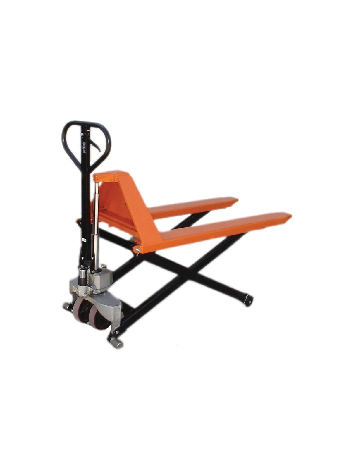 • This "hi-lift" pallet truck is ergonomically designed to reduce back injuries.